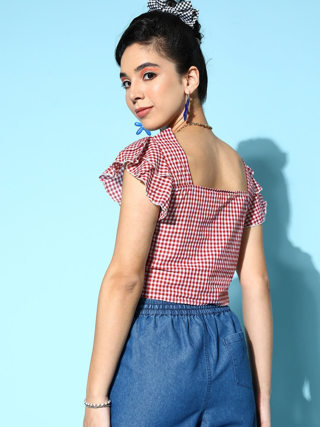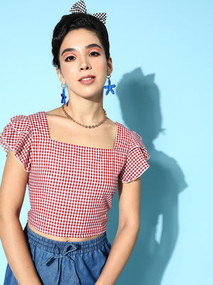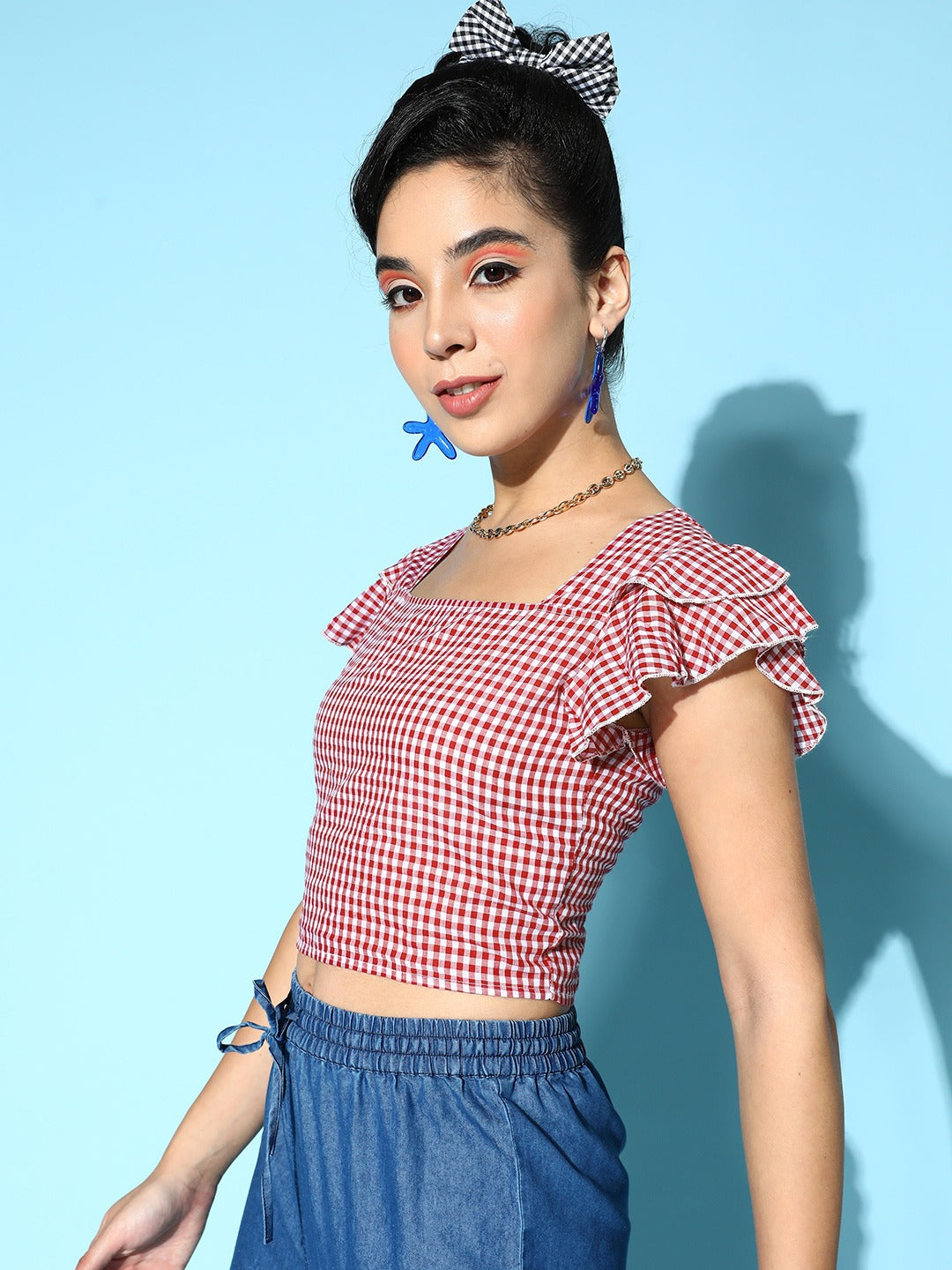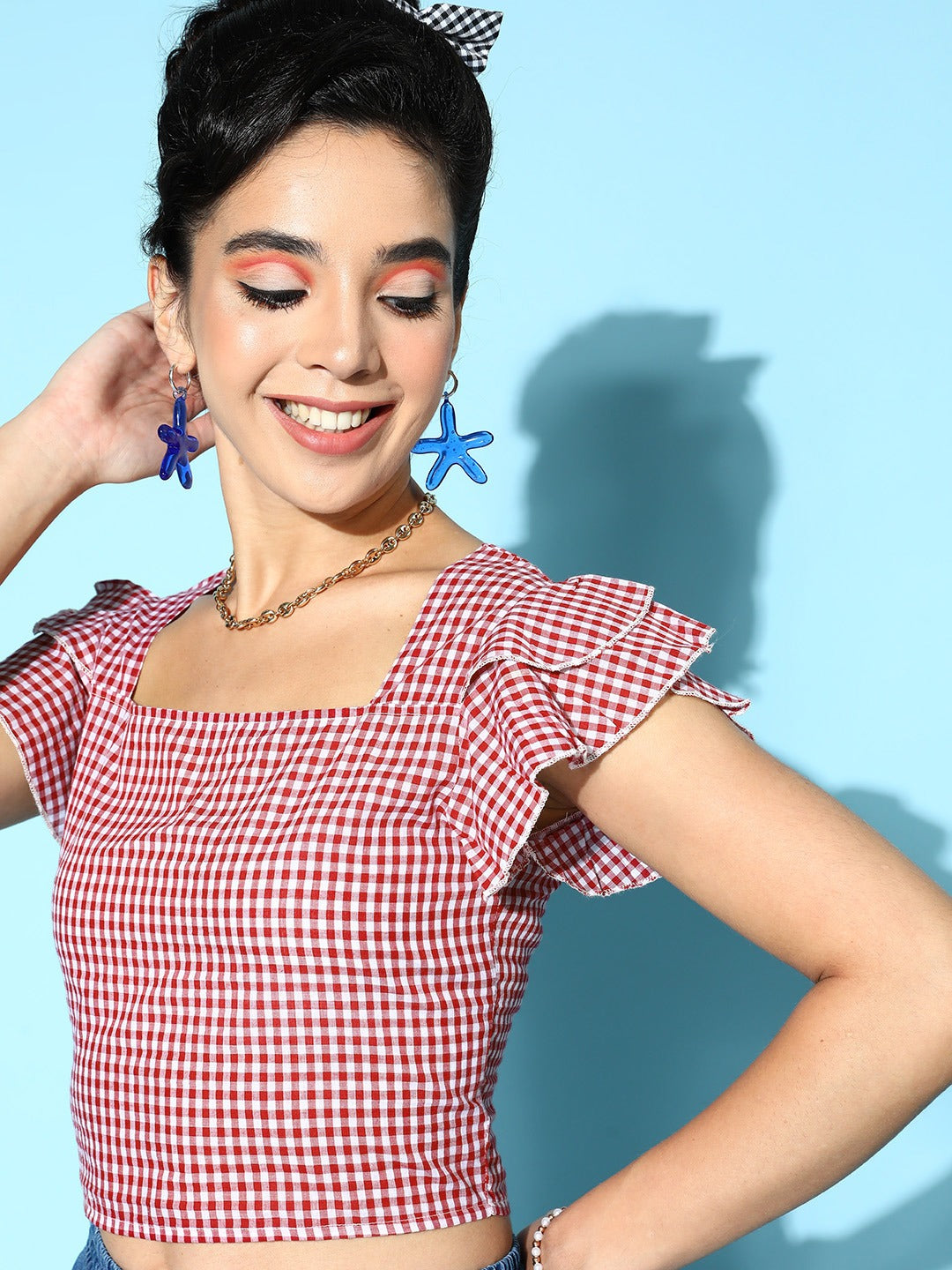 Berrylush Women Red & White Checked Pattern Square Neck Cotton Ruffled Crop Top
