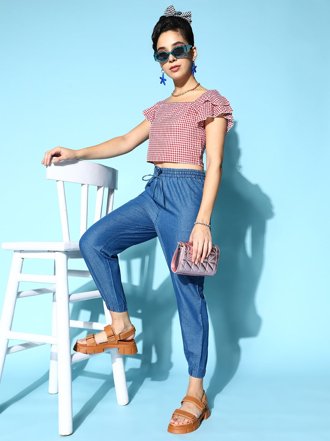 Style yourself with vintage charm and aesthetic feel by magnifying your closet with this ravishing Checked Red Ruffled Woven Crop Top designed by Berrylush for its latest print and pattern collection. Decorated with a red and white checked pattern that gives this top a striking appearance with the cinematic vibe. Fashioned with a square neckline that lends your neck and shoulders a broader and breathable outline. In addition, the woven detailing offers this top anti-stain and anti-abrasion attributes to maintain the new look. Complete your look flawlessly by wearing this top with your favourite jeans, stars hoop earrings, cute wedges, and a cute side bag.