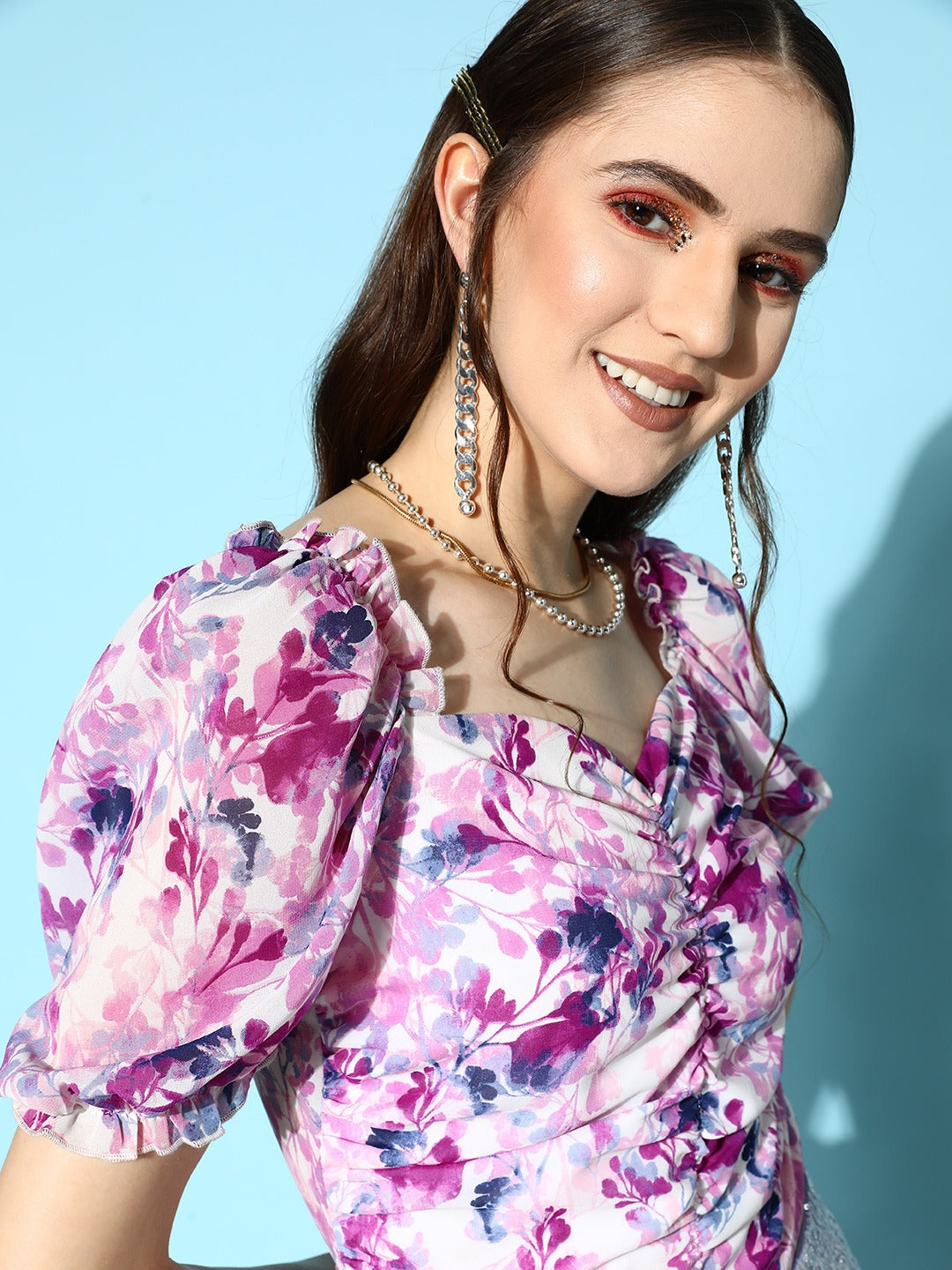 Berrylush Women White & Pink Floral Printed Sweetheart Neck Georgette Pleated Regular Top