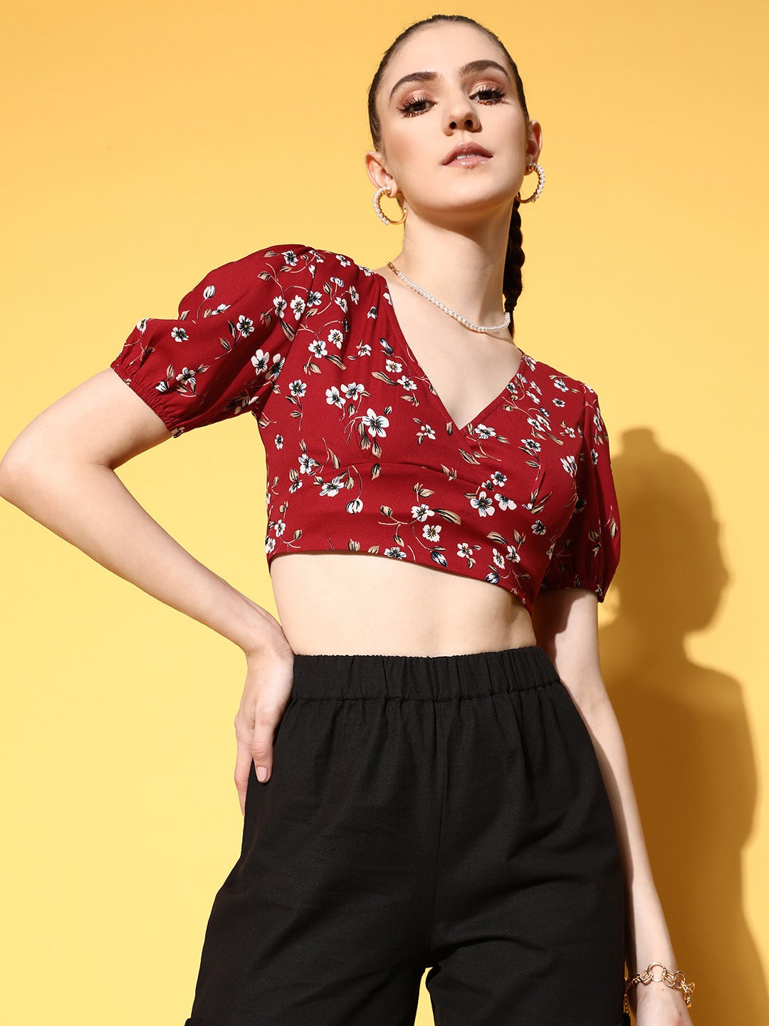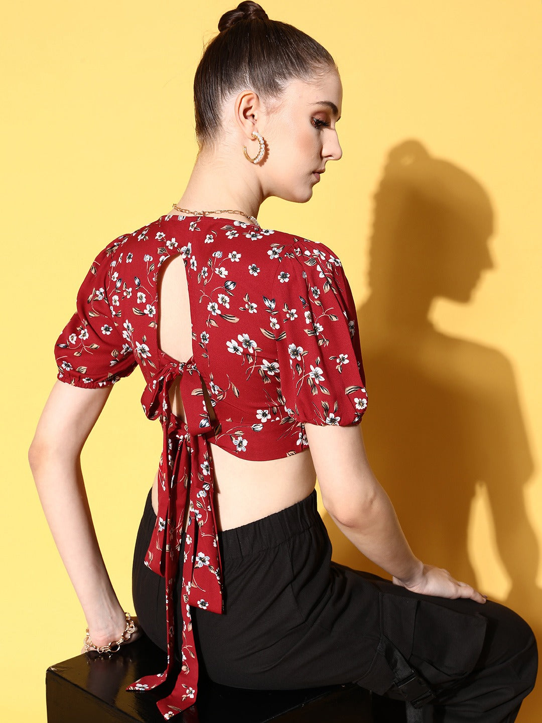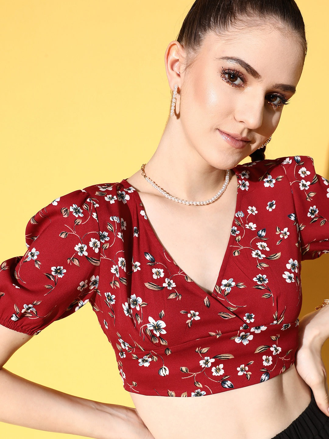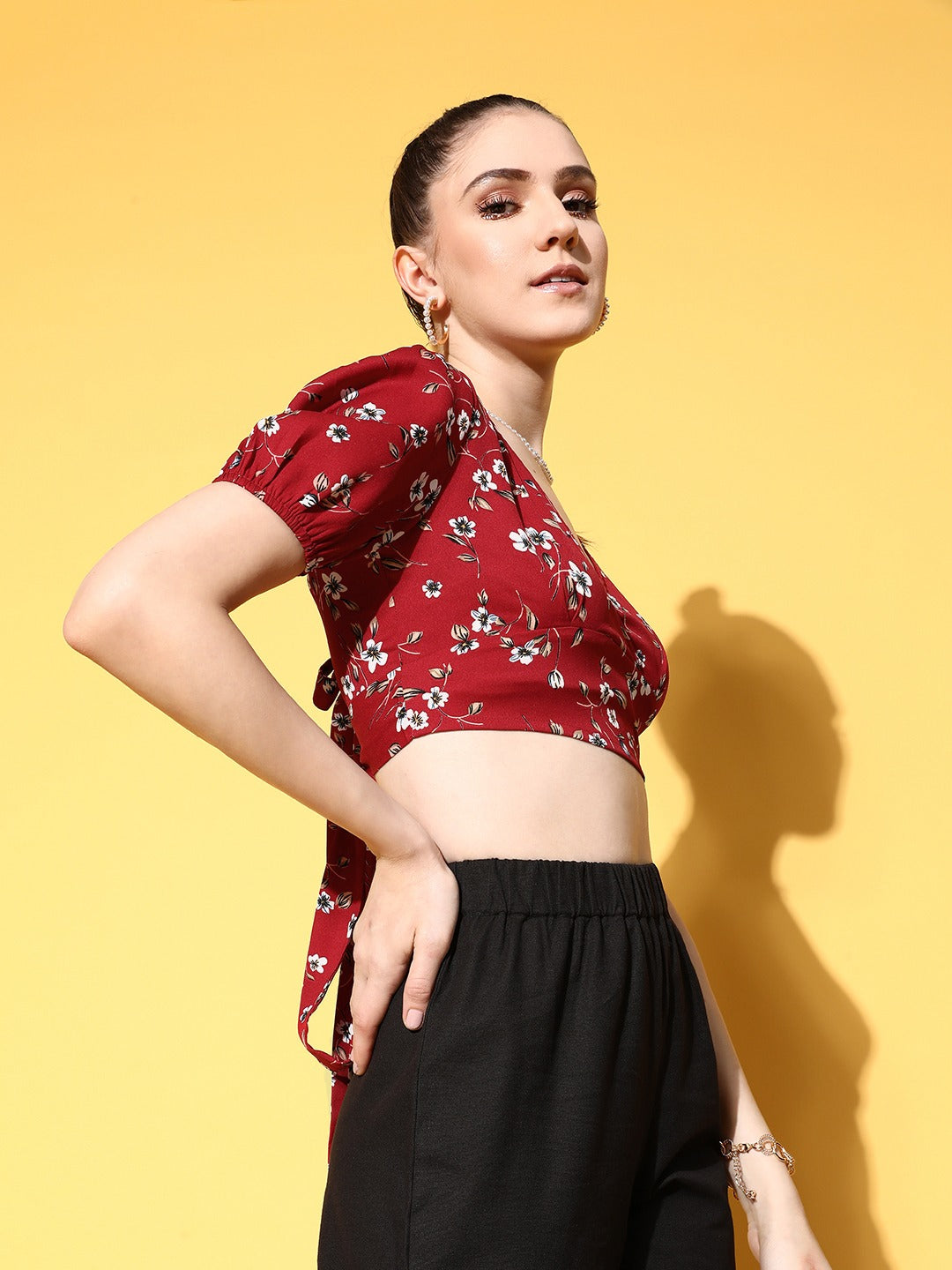 Berrylush Women Red & White Floral Printed V-Neck Tie-Up Back Crepe Wrap Cropped Top