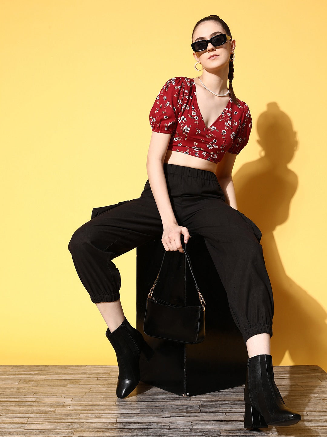 Infuse a dash of vibrancy and voguish style in your casual rotation with this charming Red & White Floral Printed V-Neck Tie-Up Back Crepe Wrap Cropped Top from the floral print collection of Berrylush. Crafted from a high-quality crepe polyester fabric for a lightweight creation with an anti-fade feature to avoid the classy appearance of this top. The woven detailing lends this top better flexibility and resistance to wear and tear issues. In addition, the tie-up closure offers an easy and secure fastening process with a convenient silhouette. Complete your weekend outdoor look by wearing this crop top with sporty trousers, a pair of black ankle boots, minimalistic jewellery, and a matching side bag.