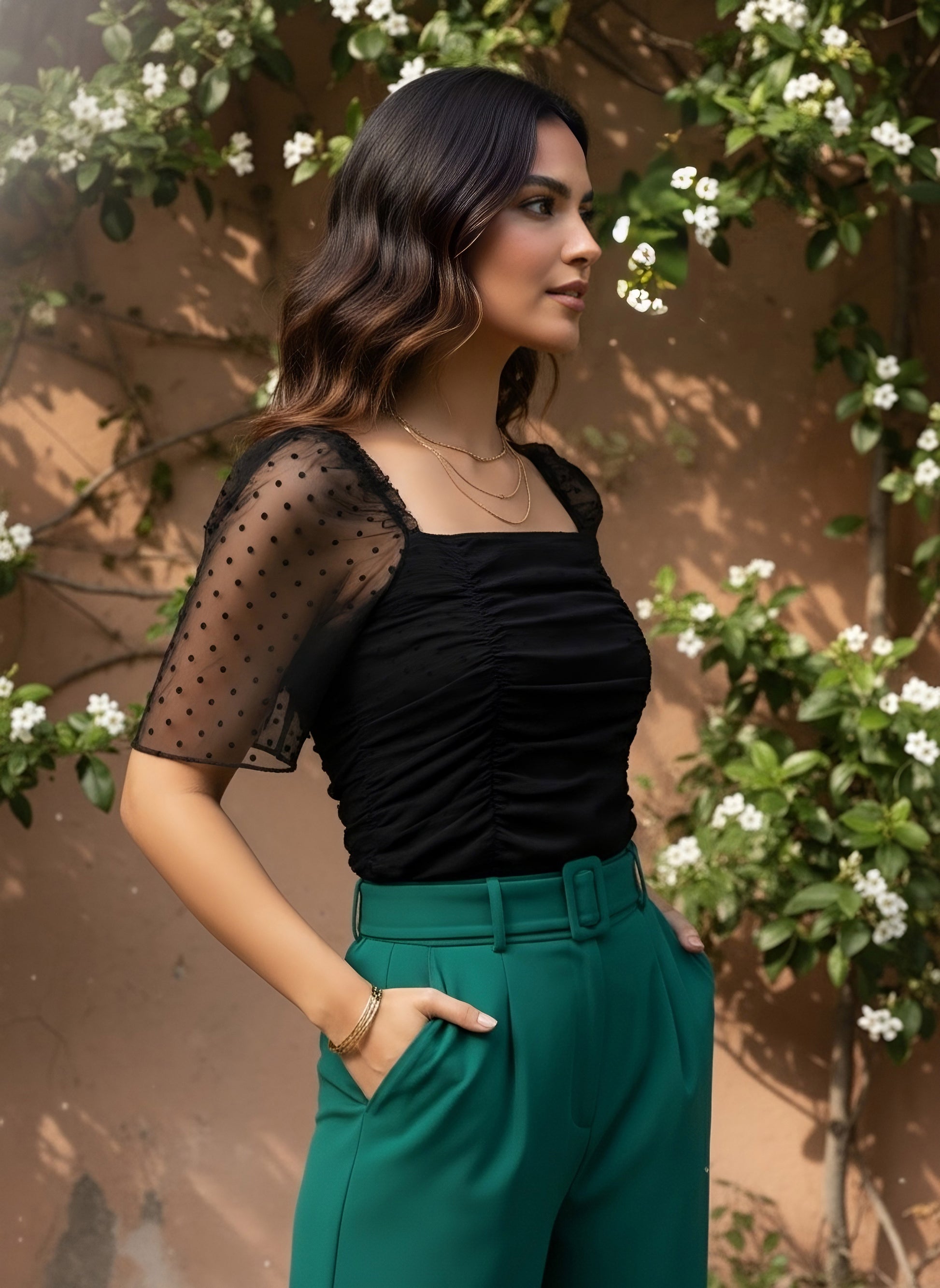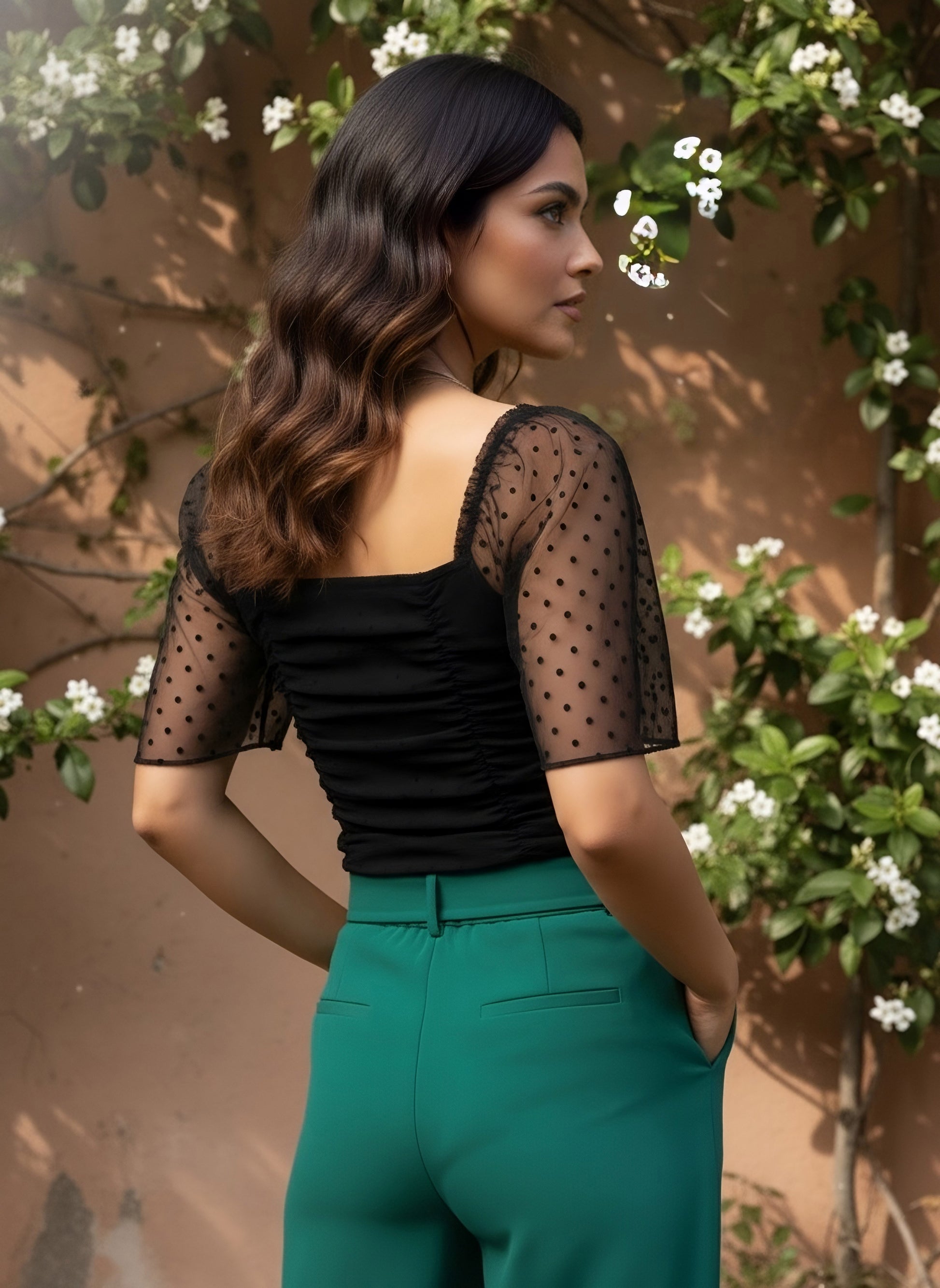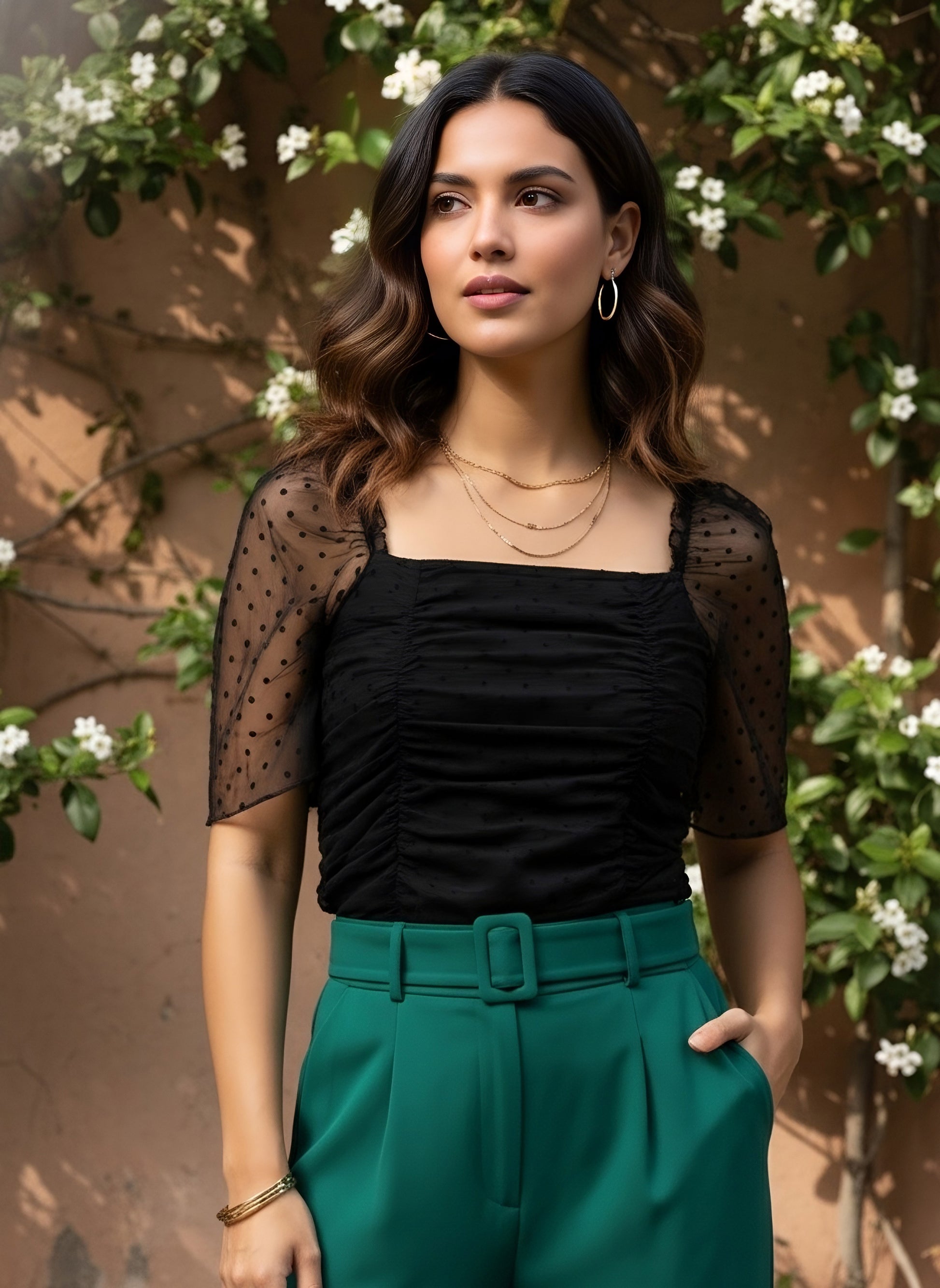 Re-define your casual assortment with an epitome of femininity and elegance with this bedazzling Solid Black Dobby Weave Square Neck Puff Sleeve Pleated Regular Top designed by Berrylush. Framed in the fitted profile that lends this top a form-fitting silhouette to gracefully highlight your curves. Spun from the finest dobby fabric that gives this top a lightweight feature with small geometric patterns and versatility. The regular length offers this top a practical design with proper coverage of your upper body and with a smart appearance. Look charming on your way out from home by pairing this top with parallel trousers, pump heels, cute silver earrings, round sunglasses, and a trendy handbag.