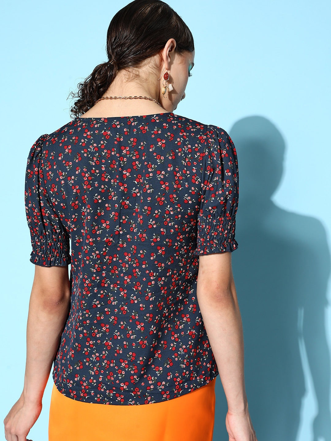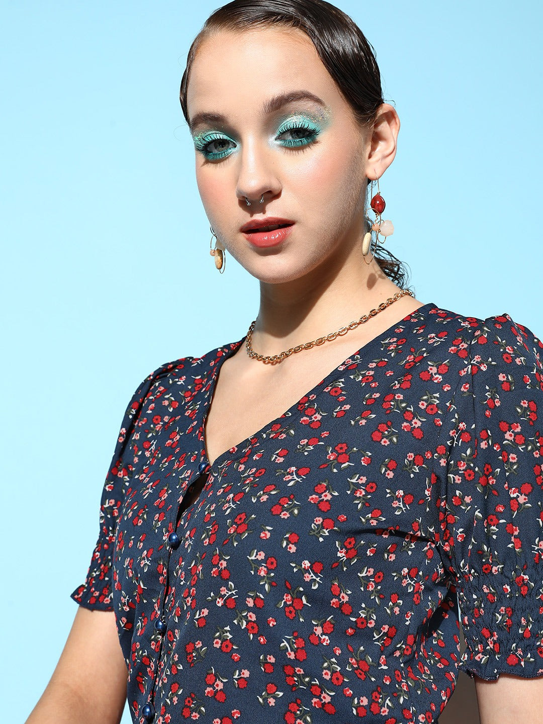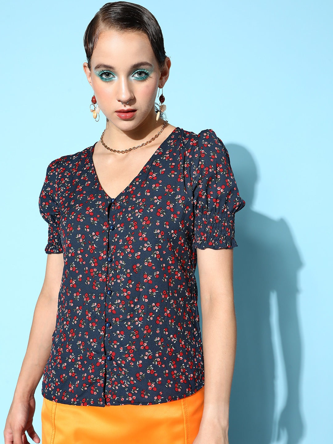 Berrylush Women Navy Blue & Pink Floral Printed V-Neck Front Button-Up Crepe Smocked Top