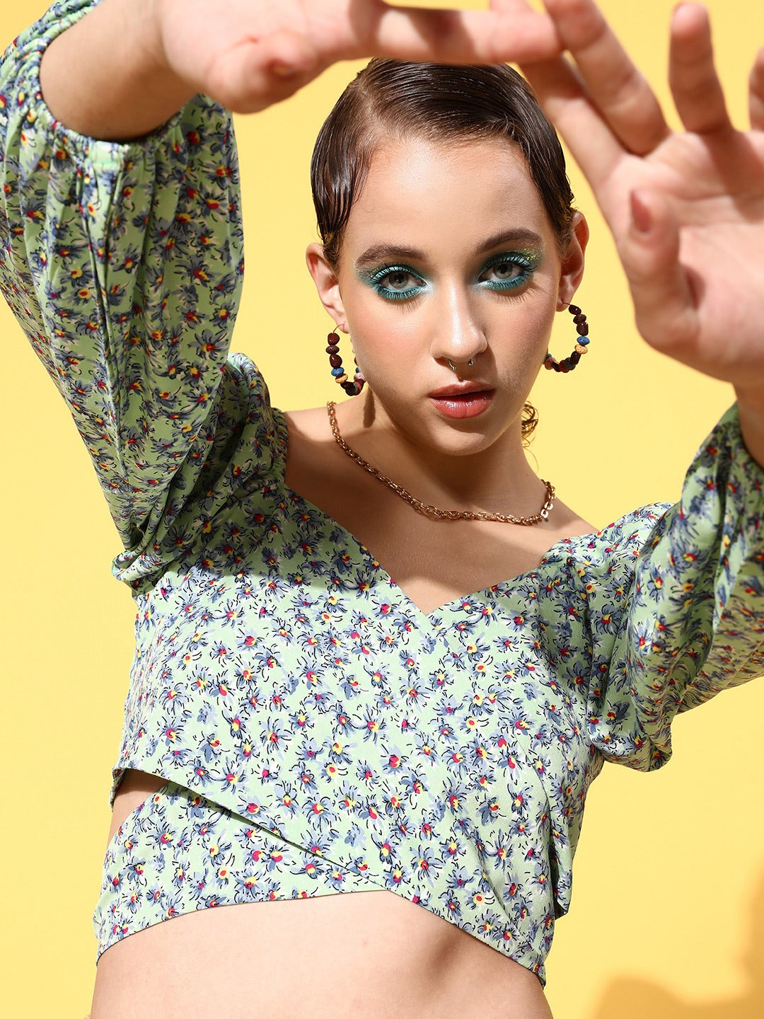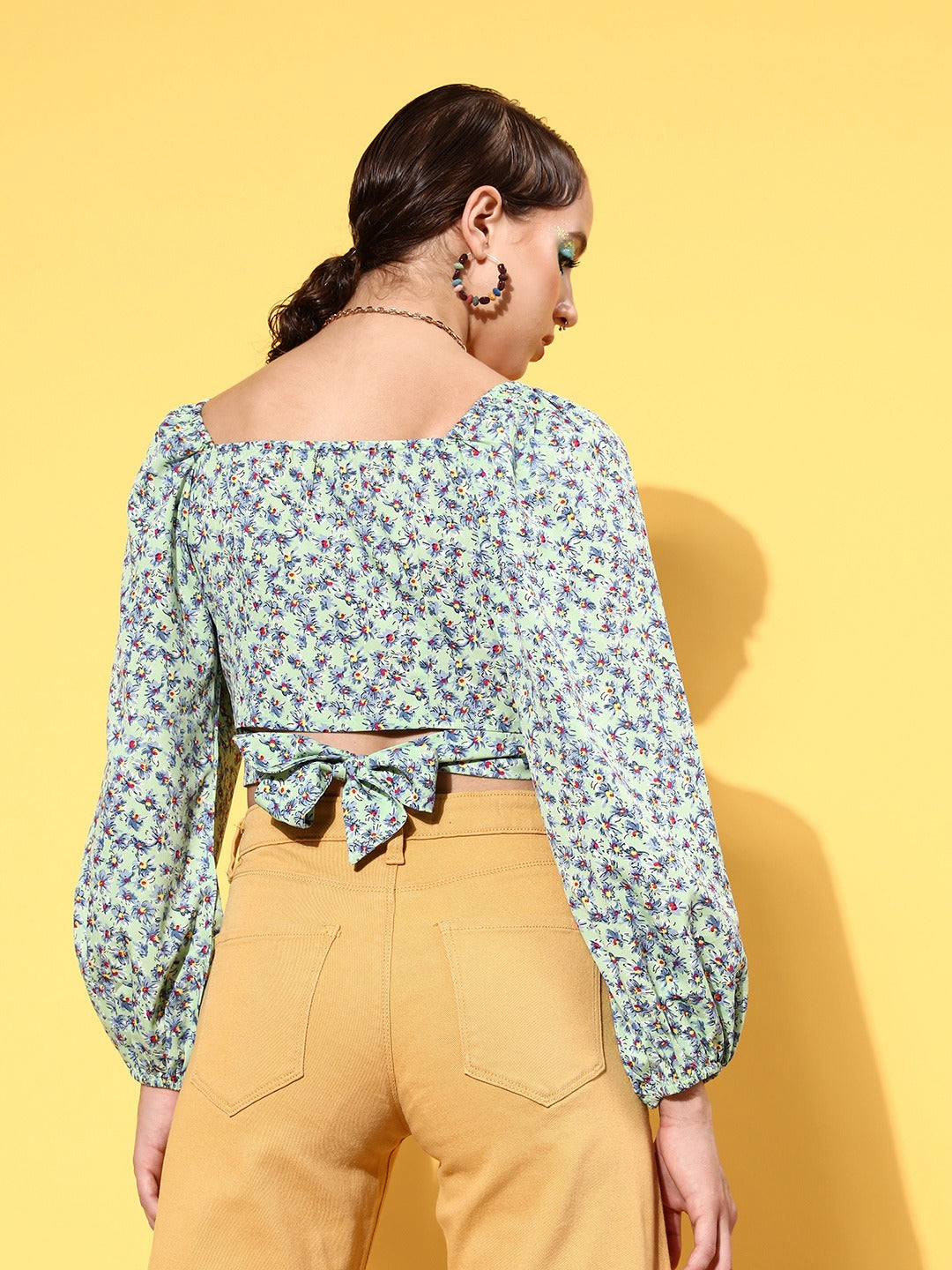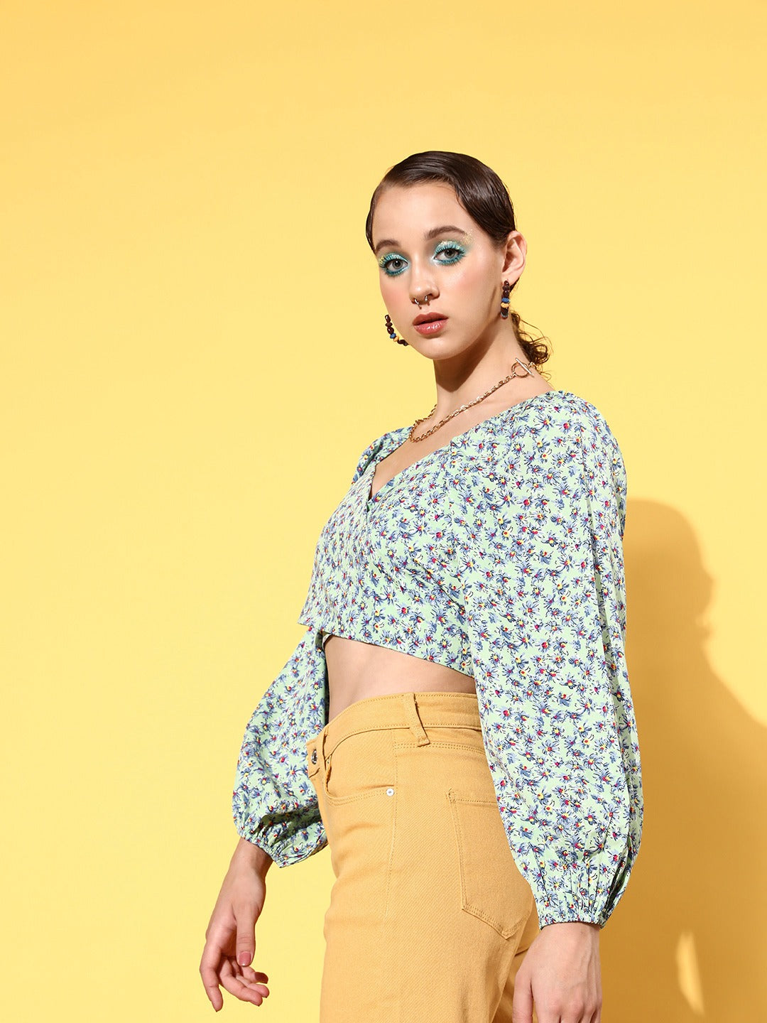 Berrylush Women Green & Blue Floral Printed Sweetheart Neck Front Tie-Up Crepe Cropped Top