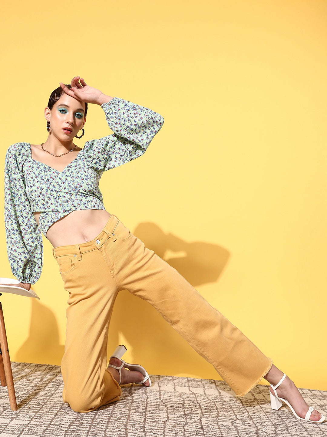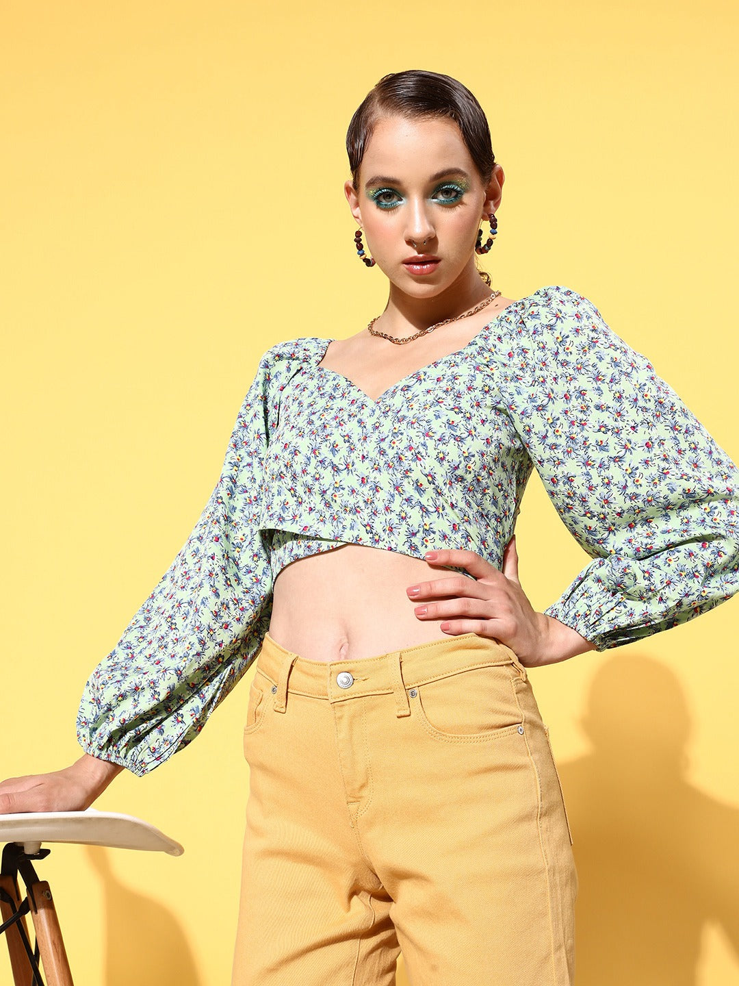 It's time to uplift your back-to-college casual collection with voguish statement pieces just like this gorgeous Green and Blue Floral Print Sweetheart Neck Crepe Crop Top from Berrylush. Showcasing long-cuffed sleeves gives your arms captivating coverage to keep them protected from harmful UV rays. Designed in crop length that makes this top appears trendy and exotic by giving your beautiful waist an alluring disclosure. Also, regular styling makes this top appear modest and upgraded with the evergreen trend. Complete your coffee date look fabulously by teaming up this crop top with contrasting jeans, a pair of white block heels, cute earrings, and a white handbag.