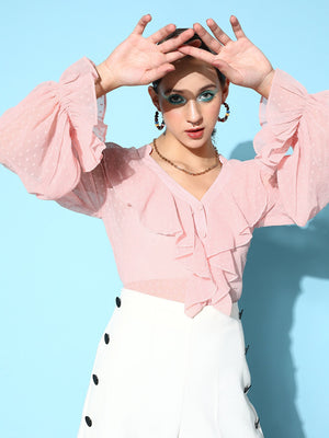 Berrylush Women Solid Pink Dobby Weave V-Neck Semi-Sheer Ruffled Regular Top