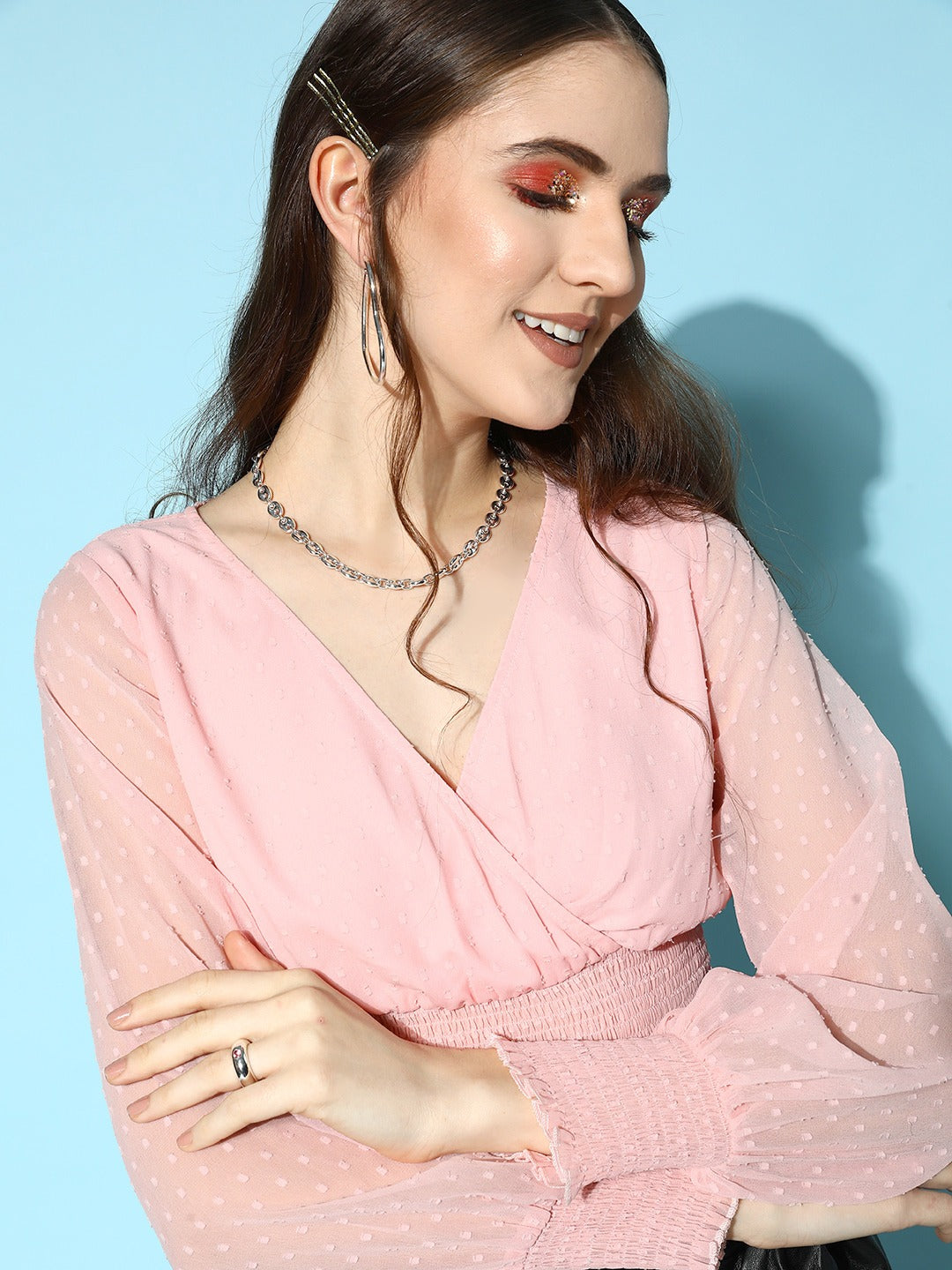 Berrylush Women Solid Pink Dobby Weave V-Neck Bishop Sleeve Georgette Smocked Empire Crop Top