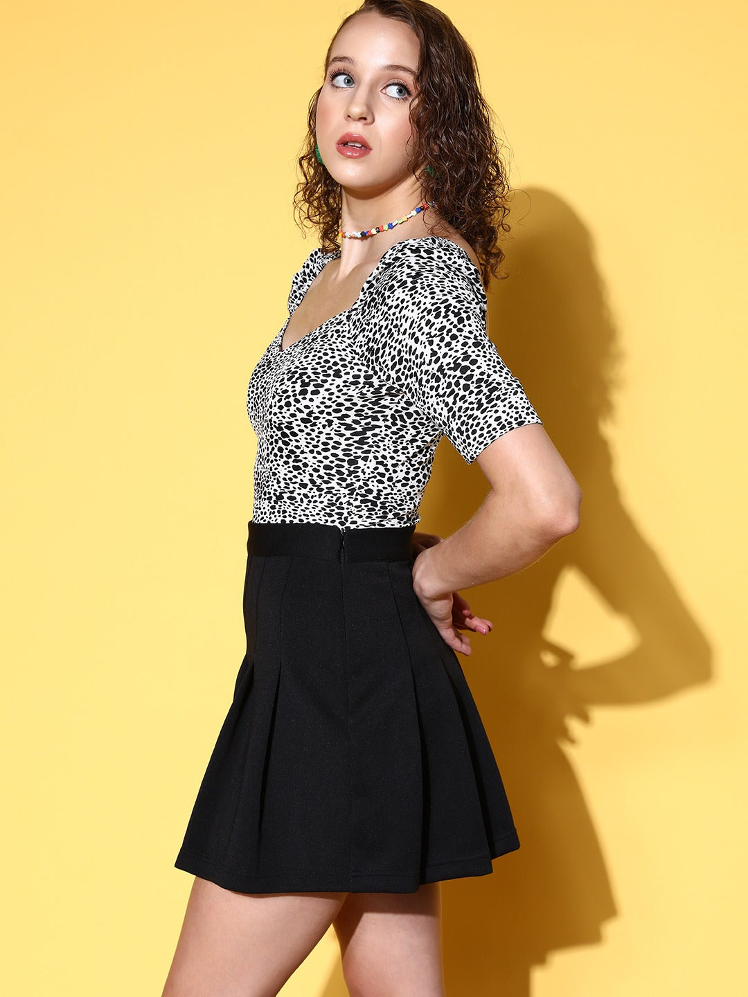 Get the elegant version of boldness along with a surprisingly versatile style note by donning this chic White and Black Animal Print Cotton Sweetheart Neck Regular Top from Berrylush. To add contrasting essence to your casual look, this top is designed with a majestic amalgam of white and black animal print that depicts your fierce personality with a confident aura. Fashioned in regular length to make this top appear sophisticated and modest. Also, the knitted detailing supports amazing durability and flexibility to keep you comfortable all day long. Wear this top with a black mini skirt, ankle-length boots, cute earrings, and a trendy side bag to create a fashion-flattering look.
