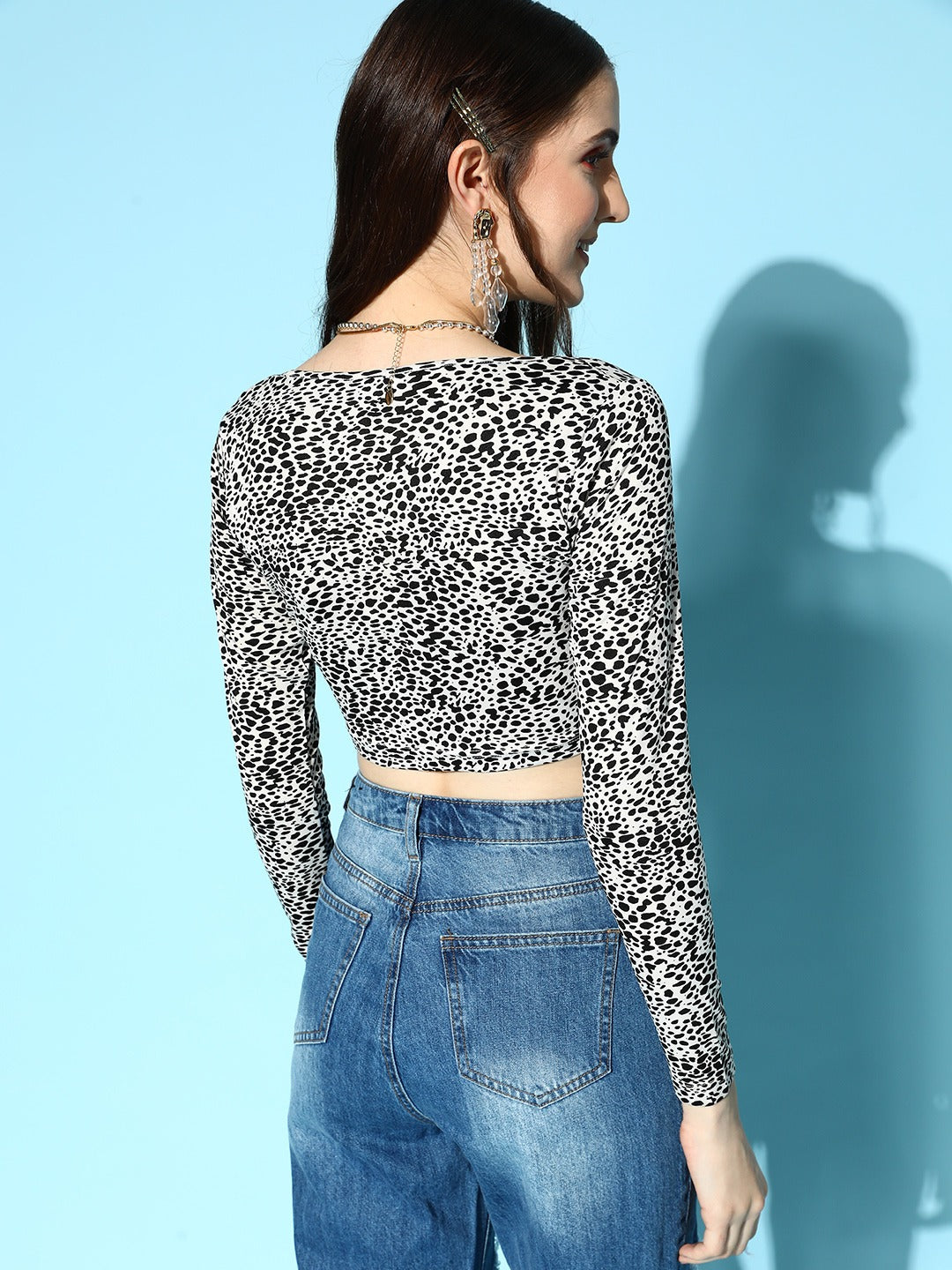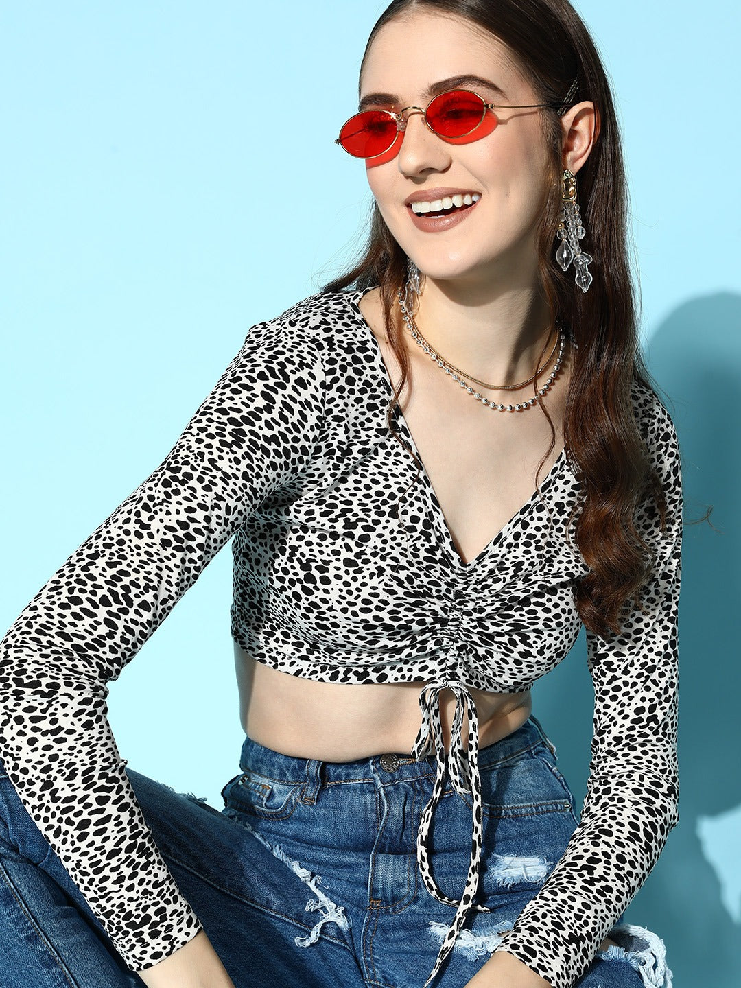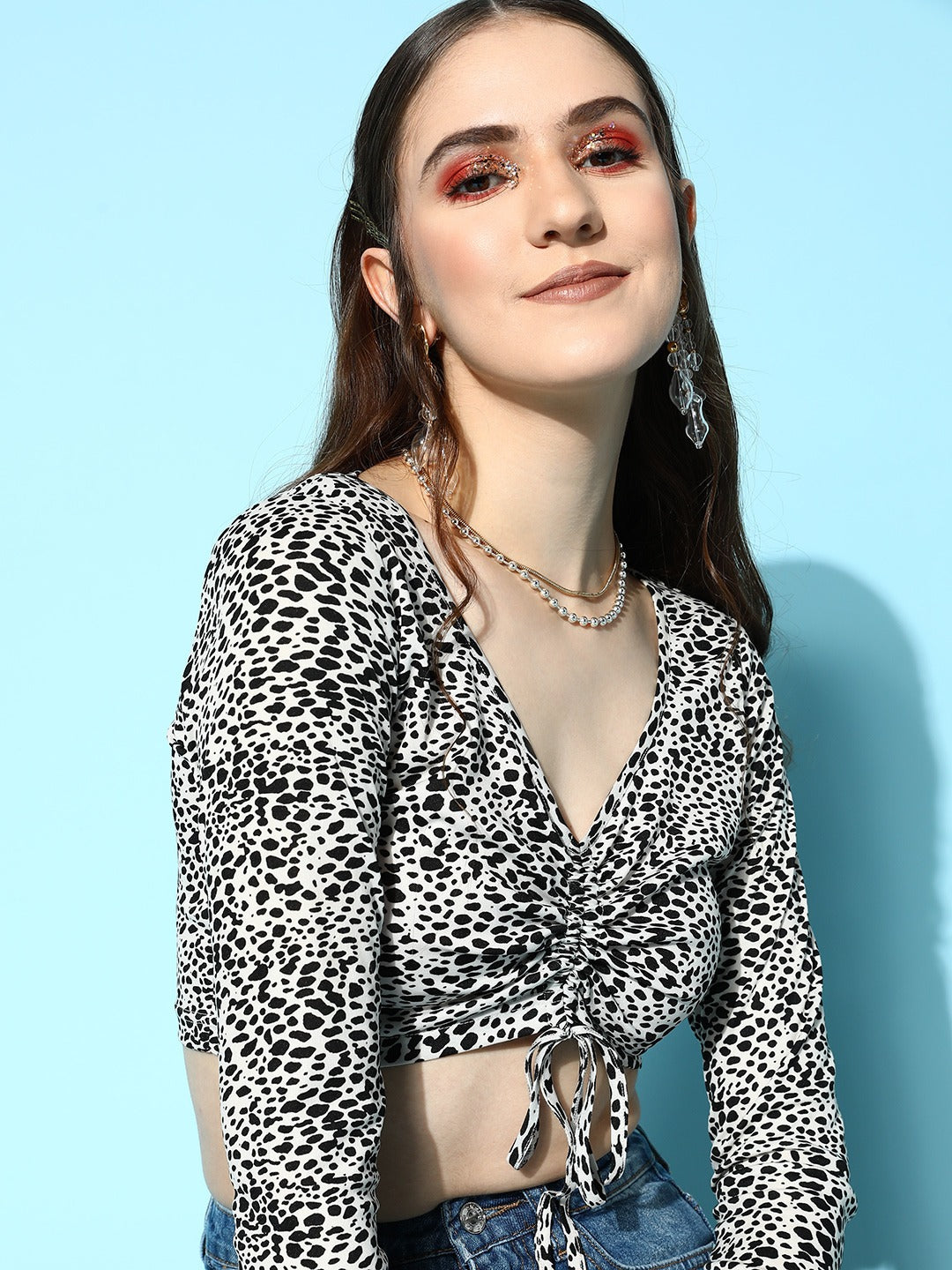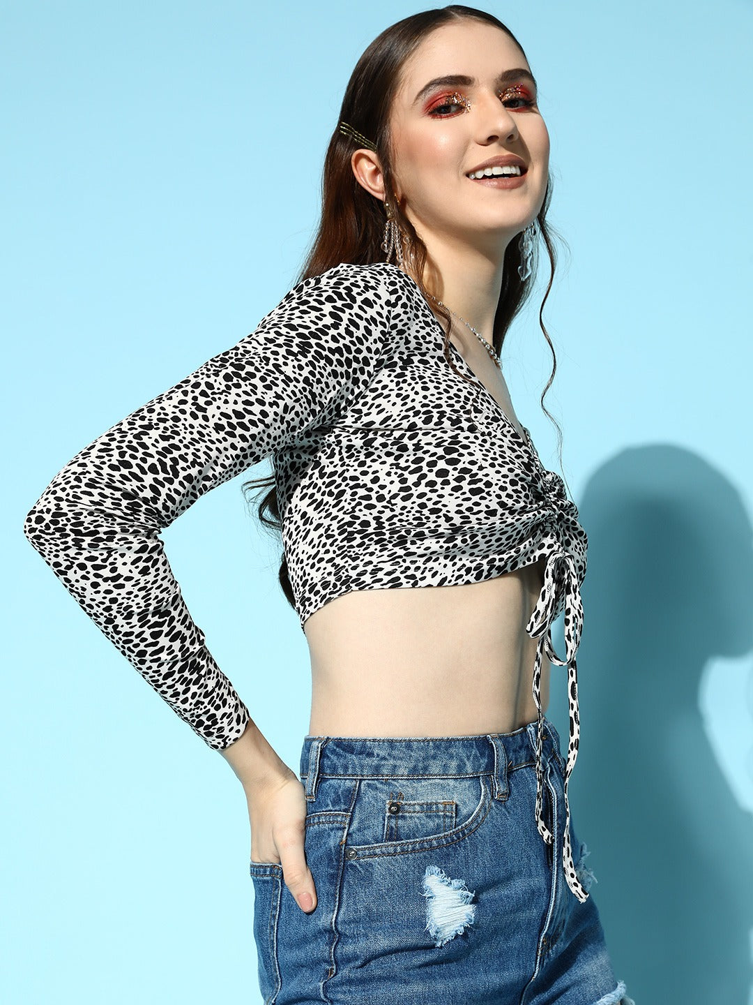Let your style match your bold and confident personality by opting for this sassy White & Black Animal Printed V-Neck Front Tie-Up Cotton Pleated Crop Top from Berrylush. Milled from the finest cotton fabric to keep this top comfortable and cosy with uninterrupted breathability. Flaunts long-regular sleeves that lend this top a classy style while protecting your arms from harmful Sun rays. In addition, the gathered surface styling adds textures sheen and a voluminous appeal to this top. Wear this crop top with wide-leg jeans, a pair of high-heels, fashionable sunglasses, and a cute side bag for a fascinating look.