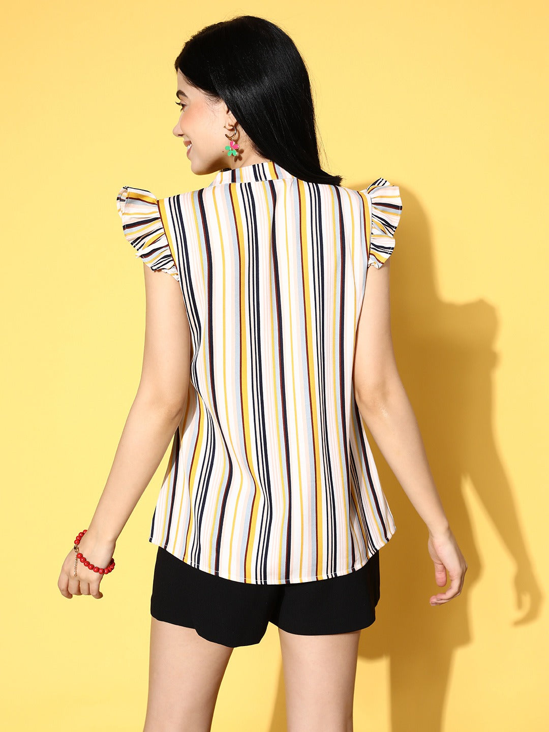 Berrylush Women Yellow, White, & Black Striped Print Mandarin Collar Neck Crepe Ruffled Regular Top