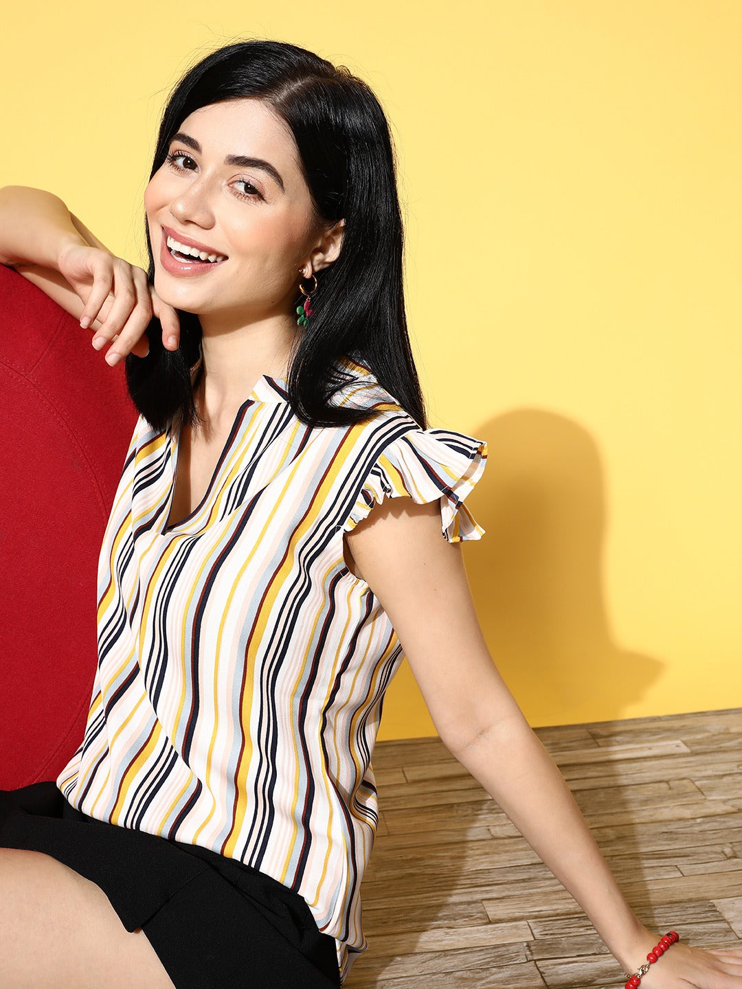 Indulge your summer style with eclectic prints followed by a ritzy vibe by investing in this charming Yellow, White, & Black Striped Mandarin Collar Ruffled Crepe Top from Berrylush. Beautifully tailored from premium quality crepe polyester fabric that lends this top delicate touch against your skin with limitless comfort. Flaunting mandarin collar design that gives this top a classy appeal with an edgy and semi-formal definition to your neckline. Also, the regular length makes this top appear elegant, modest, and perfect for any casual event. Create a fashion-forward look by teaming this crepe top with a black mini skirt, a pair of comfy sandals, pearl earrings, and a small chic handbag.