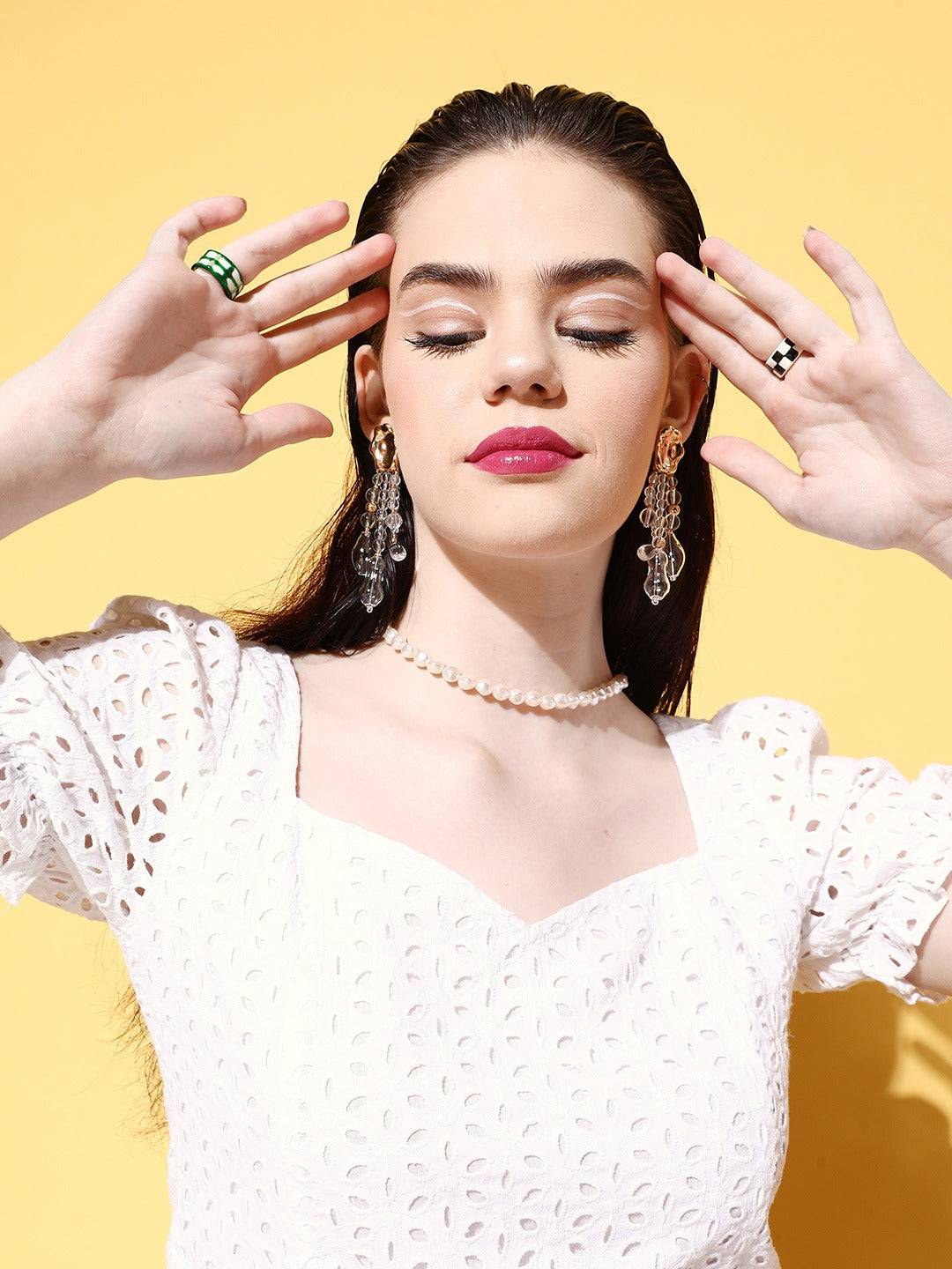 Channel feminine and chic charm this summer season by wearing this cute Solid White Sweetheart Neck Puff Sleeve Woven Schiffli Cropped Top from Berrylush. Fashioned in a ribbed profile with the premium quality schiffli cotton fabric that makes this top appear sassy. Designed in crop length to give astonishing exposure to your waist with an edgy appearance. The woven detailing offer this top outstanding resistance from water-based stain along with a shape-retaining feature. You can team up this crop top with a pair of pink tie and dye print jeans, block heels, pearl jewellery, and a pink side bag.