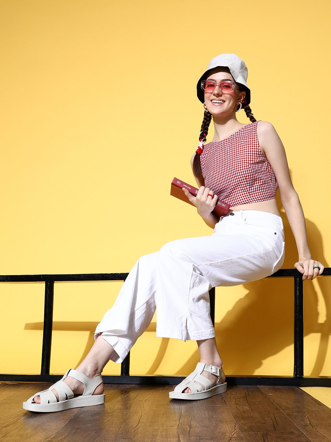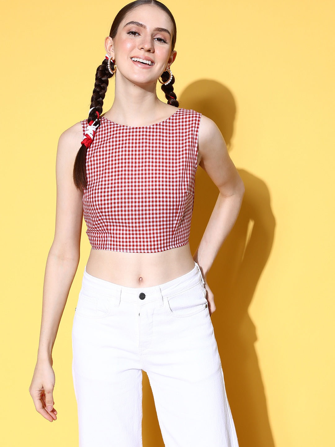 Get the perfect mix of style, chic, and comfort within your capsule assortment with this ravishing Red and White Checked Cotton Styled Back Crop Top from Berrylush. Spun from super soft pure cotton fabric that makes this top lightweight, breathable, and skin-friendly. The round neck design makes this top appear modest and sophisticated without exposing your necklines. Styled in a sleeveless design that lends this top versatility with an enticing exposure to your beautiful legs. Walk out looking glamorous by wearing this crop top with high-waist jeans, a pair of block heels, cute white sandals, matching jewellery, and a side bag.