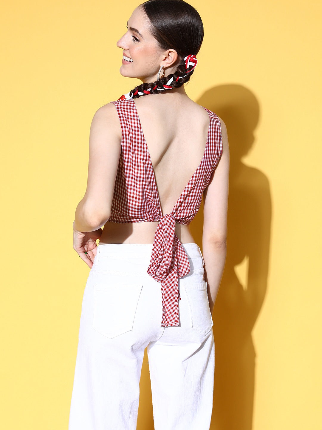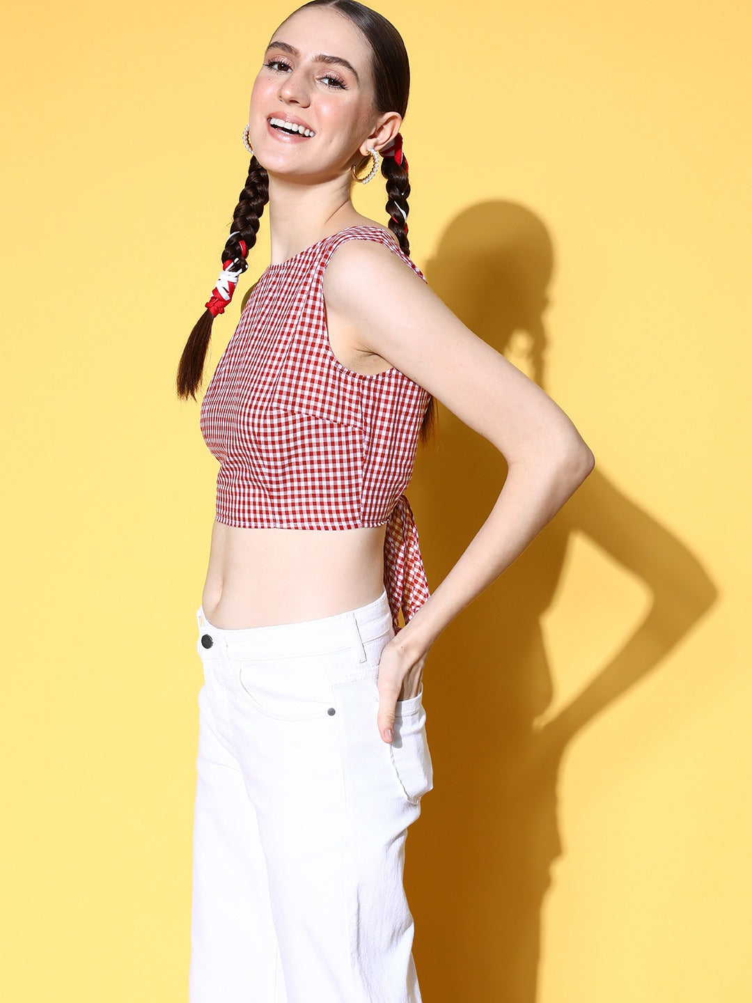 Berrylush Women Red & White Check Printed Round Neck Cotton Styled Tie-Up Back Crop Top