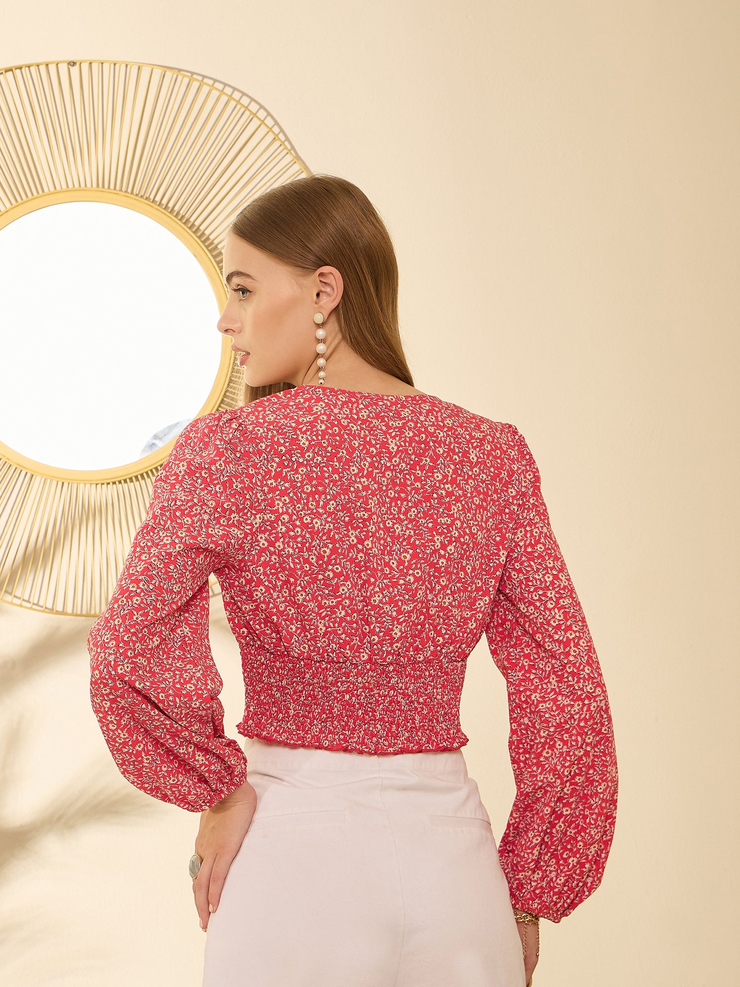 Berrylush Women Red & White Floral Printed V-Neck Bishop Sleeves Smocked Crop Top