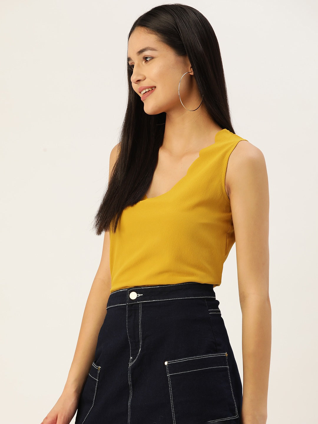 Fall in love with a modest yet voguish fashion statement by opting for this charismatic Solid Yellow V-Neck Sleeveless Regular Top designed by Berrylush. This captivating top features a solid pattern that adds a touch of classiness and voguish detail to your ensemble. Highlighting V-neck design that lends a sense of chicness to your neckline with a vertical impression. Moreover, the woven detailing gives this top a seamless and sleek appeal with delicate touch against your skin. Catch up with your friends at your favourite café while looking fabulous by wearing this regular top with high-waist jeans, golden hoop earrings, a pretty floral pendant, a pair of yellow high-heels, and a cute side bag.