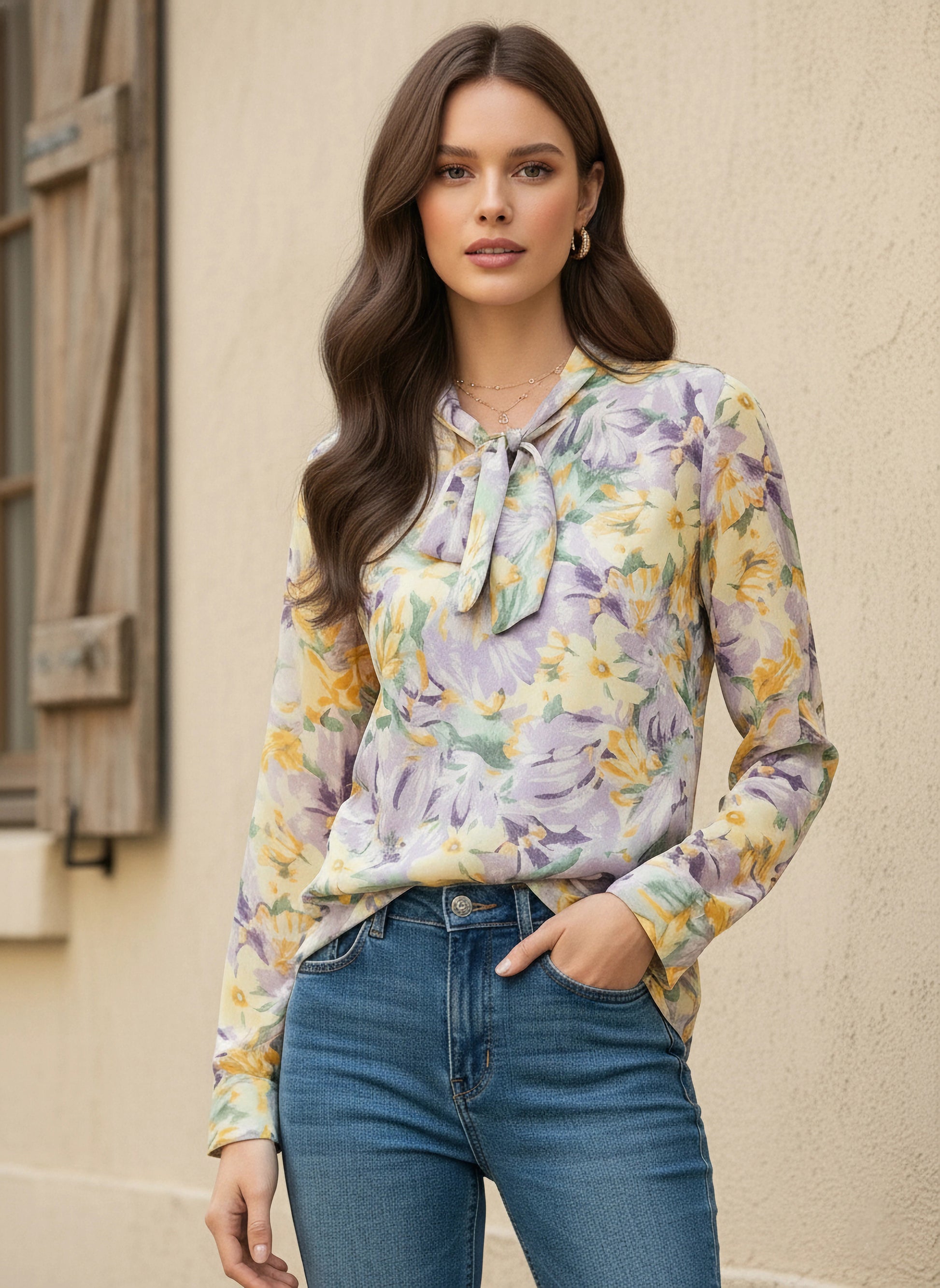 Berrylush Women Purple & Yellow Floral Printed Tie-Up Neck Long Sleeves Straight Hem Regular Top