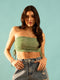 Berrylush Women Green & White Floral Printed Strapless Neck Sleeveless Tie-Up Ruched Crop Tube Top