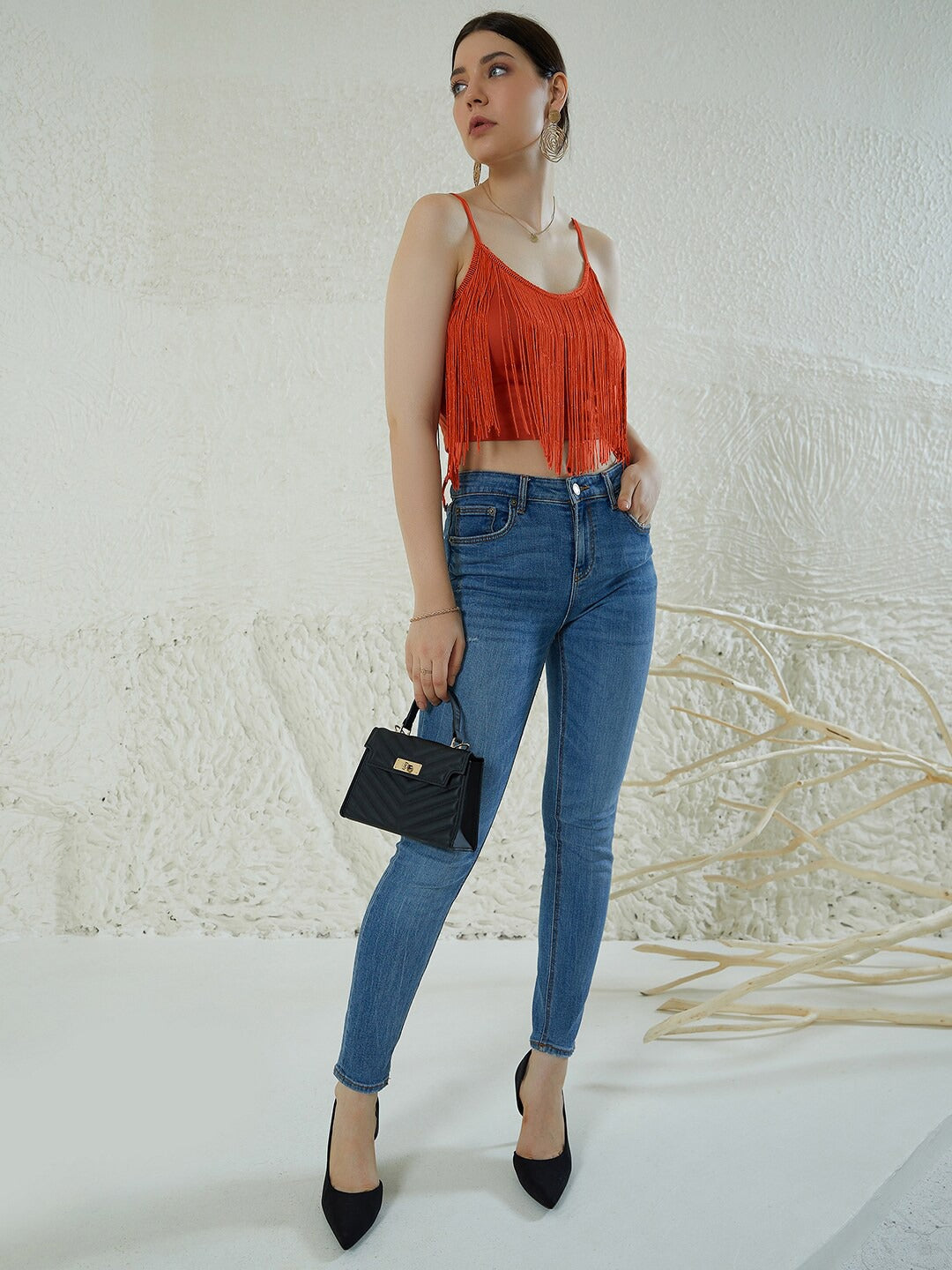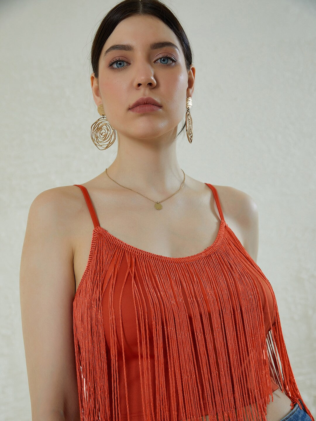 Amplify your summer wardrobe collection with a bold and intimate ascent by wearing this ravishing Solid Orange Round Neck Sleeveless Fringed Crop Top designed by Berrylush. You will find this top alluring as the beautifully crafted round neckline gives an eccentric exposure to your neckline while the fringed surface styling adds a lustrous sheen. Spun from polyester blend fabric to keep the top lightweight with high sweat-absorbing properties which makes the top an appropriate outfit option for hot summer days. This solid orange top can be styled up with black fitted jeans, hoop earrings, and a pair of high heels to get a sassy look.
