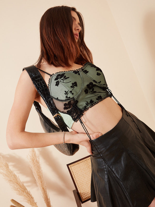 Berrylush Women Green & Black Floral Printed Sweetheart Neck Sleeveless Cotton Lace Smocked Crop Top