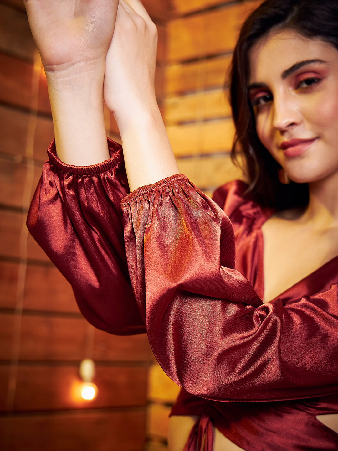 Berrylush Women Solid Brown Sweetheart Neck Bishop Sleeve Back Tie-Up Cutout Satin Ruched Crop Blouse
