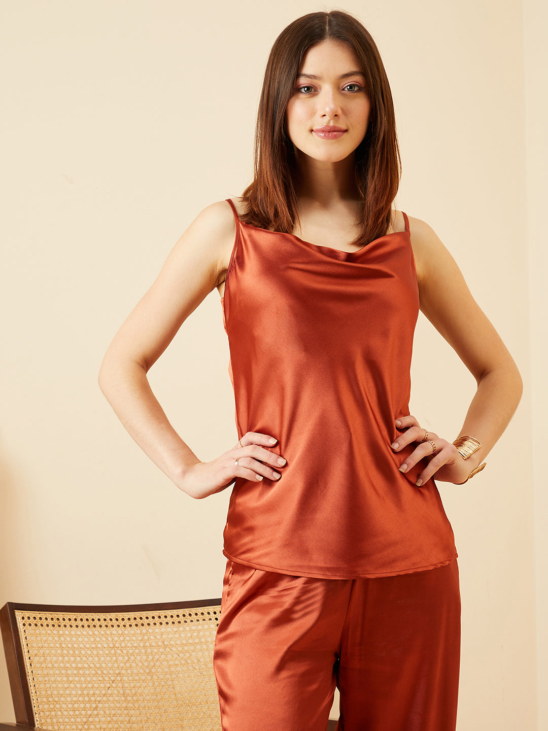 Berrylush Women Solid Brown Draped Neck Sleeveless Satin Straight Hem Regular Cami Top