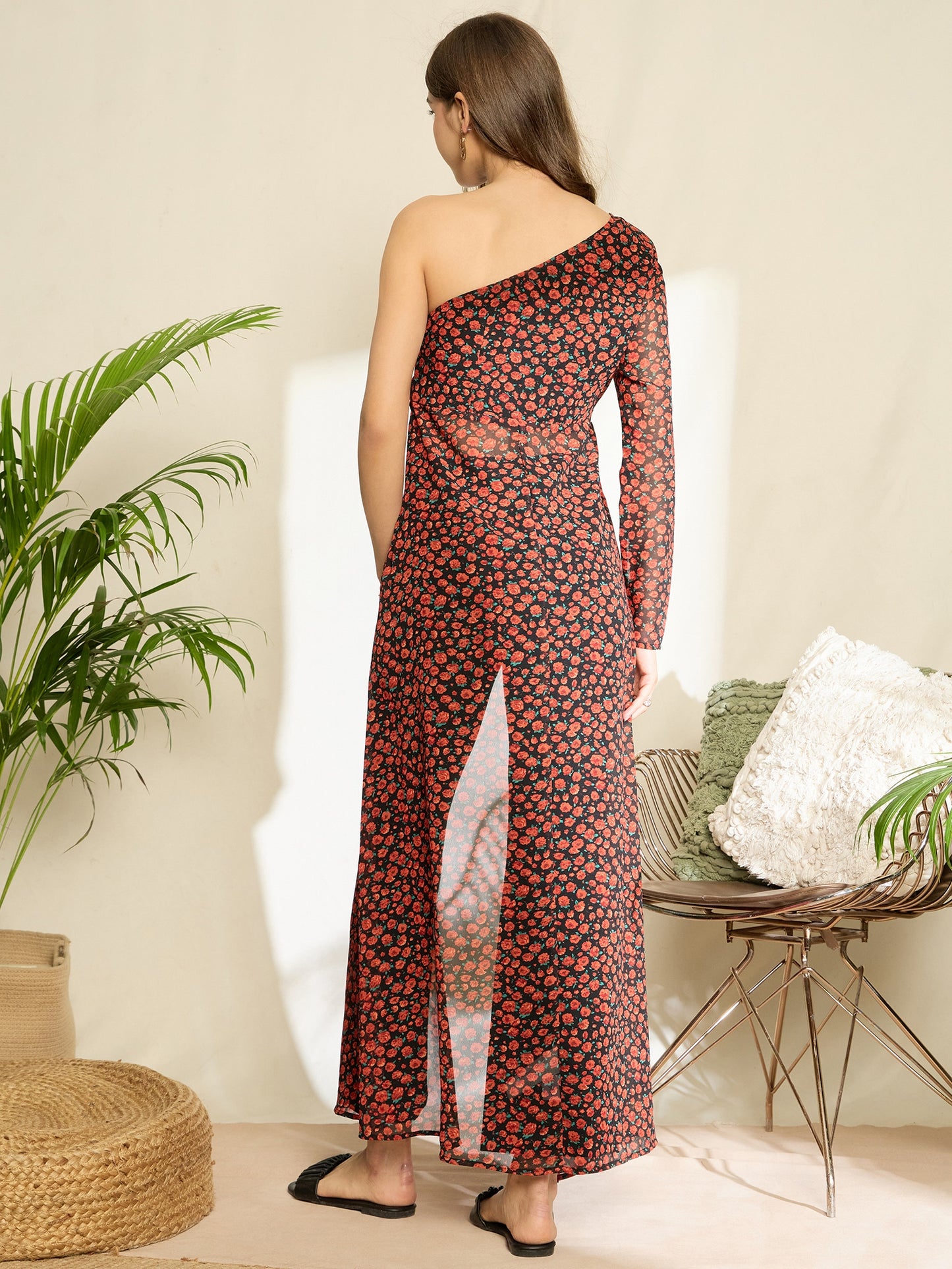 Berrylush Women Black & Red Floral Printed One-Shoulder Neck Belted Waist Split-Front High-Low Hem Longline Top