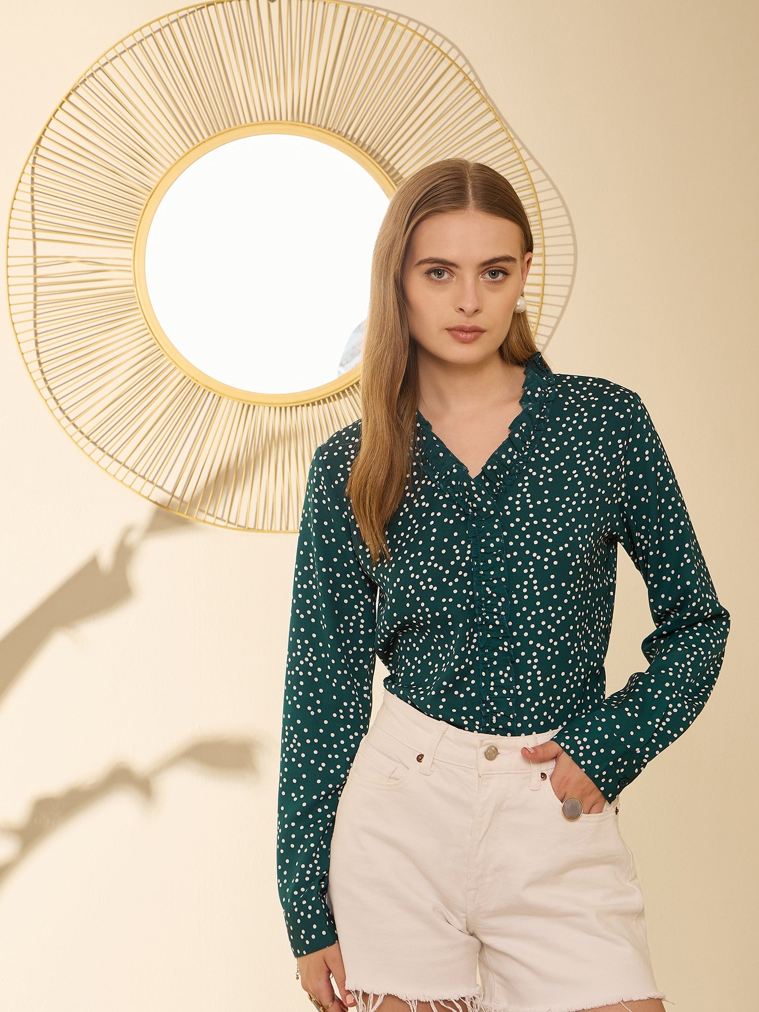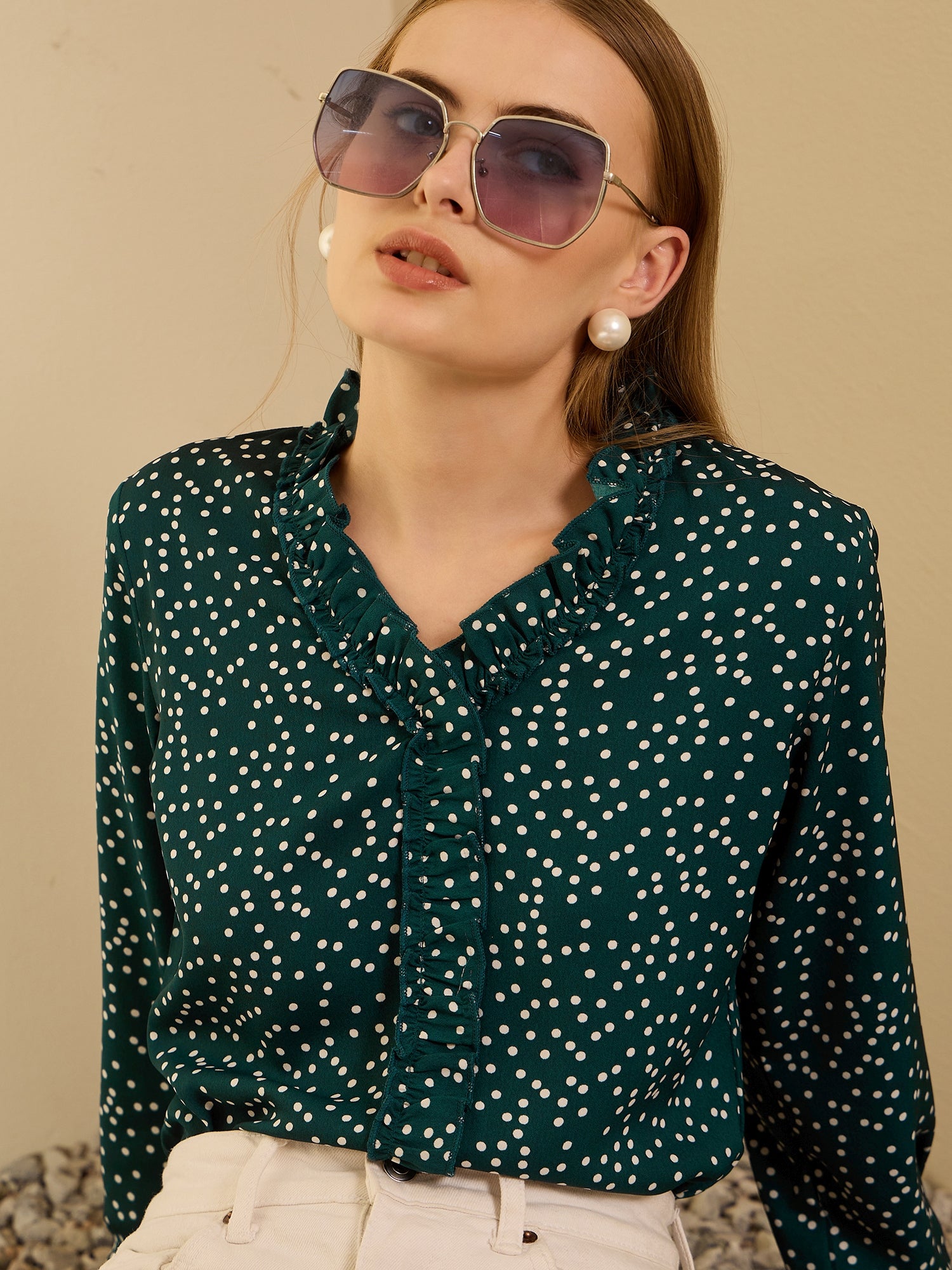 Introducing the Berrylush Green & White Polka Dot Printed Top, a playful yet elegant addition to your wardrobe. Perfect for casual outings, this top features a charming V-neck and long sleeves that blend classic style with modern flair. The eye-catching green and white polka dot print is set against lightweight, opaque polyester fabric that ensures both comfort and durability. Meticulously designed with pleated surface styling for a graceful flow, this regular-length garment enhances your silhouette beautifully. Embrace effortless sophistication in every wear with this exquisitely woven piece from Berrylush.