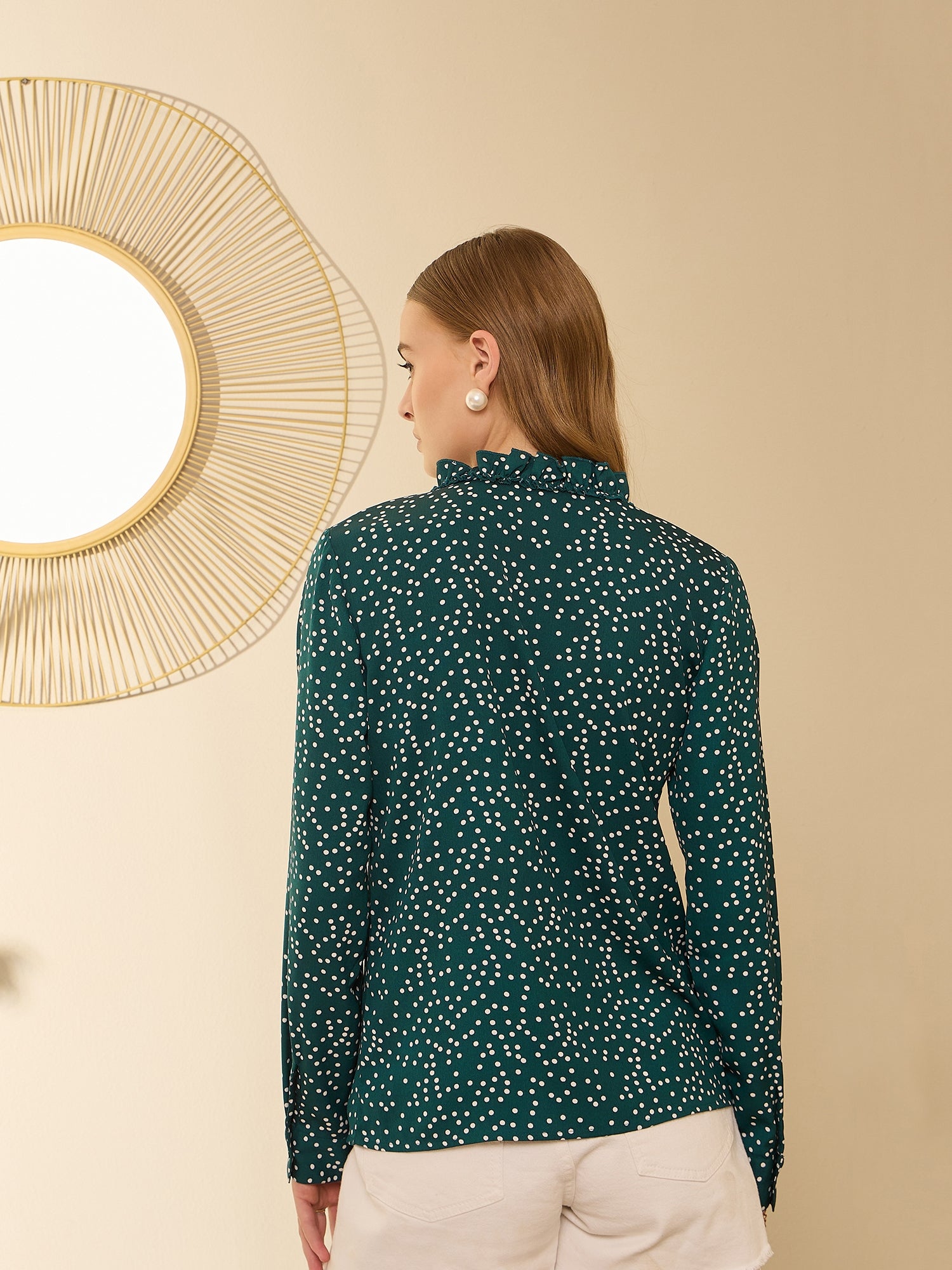 Berrylush Women Green & White Polka Dot Printed V-Neck Long Sleeves Pleated Regular Top