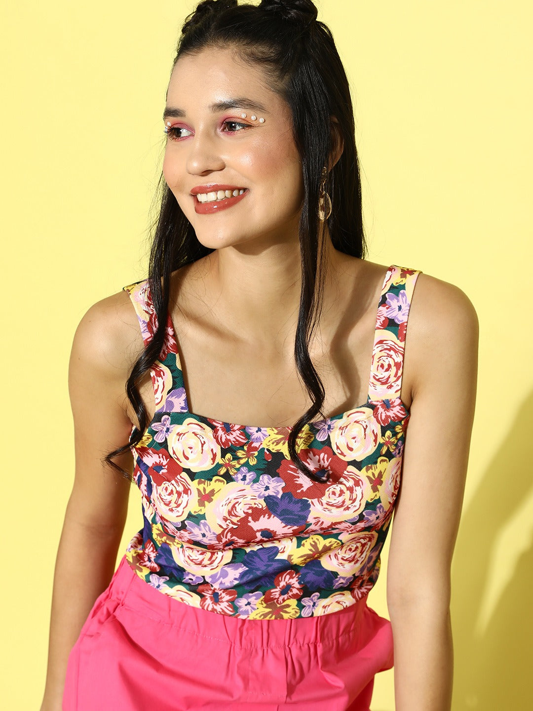 Berrylush Women Multicolour Floral Printed Square Neck Sleeveless Crepe Knitted Regular Top