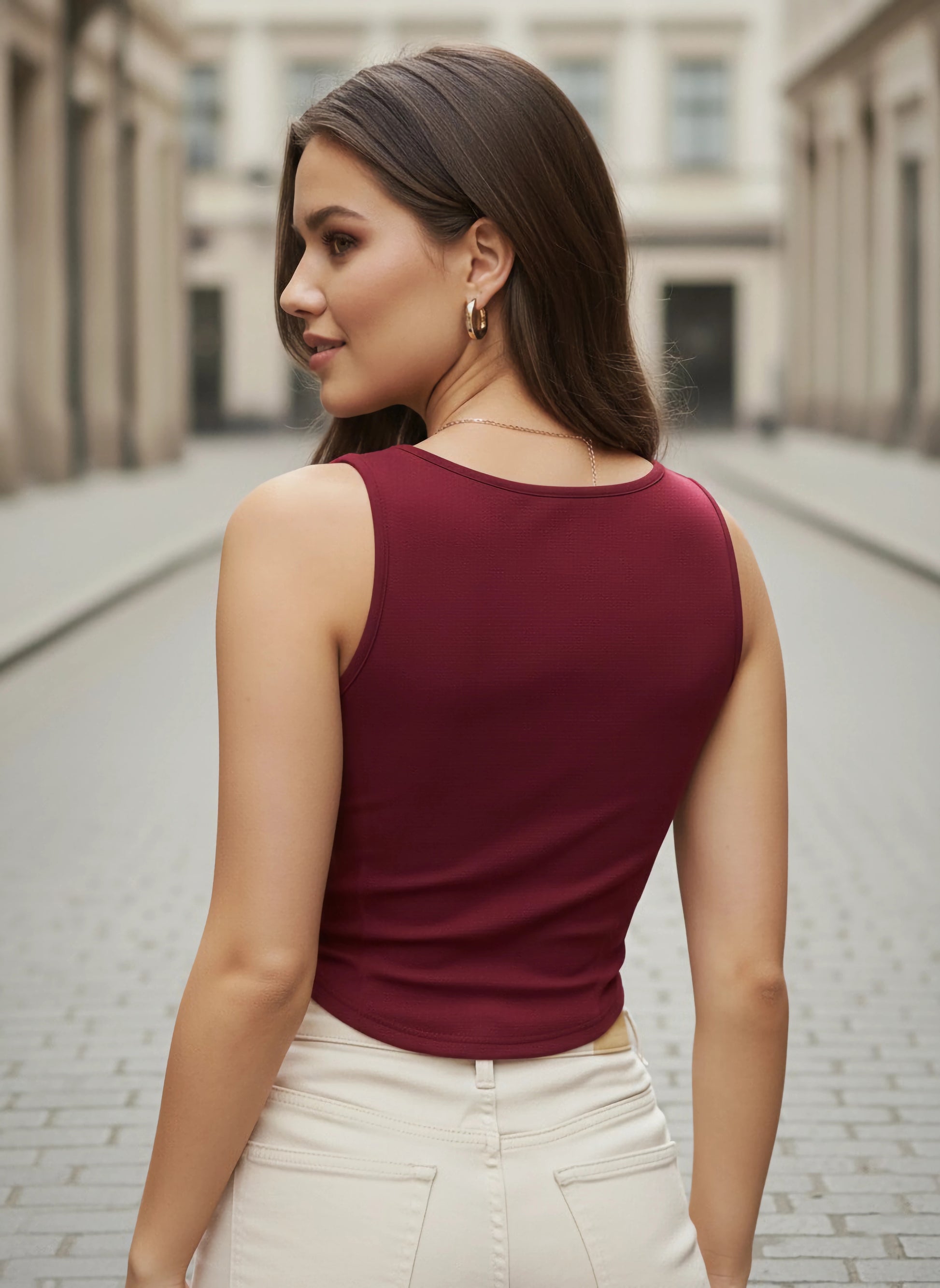 Introducing the quintessence of smart-casual attire from Berrylush: the Solid Red Scoop Neck Sleeveless Fitted Crop Top. Designed for the modern woman, this piece brings together elegance and comfort in an eye-catching red. Crafted with high-quality polyester to offer a knitted texture that complements any silhouette, its solid pattern exudes a sleek profile perfect for various occasions. The fitted design elegantly hugs your curves, highlighting your shape with its crop length and flattering scoop neckline—void of sleeves for a breezy feel on those warmer days or layered sophistication during cooler evenings. An opaque fabric ensures coverage and confidence as you embrace versatility in style.