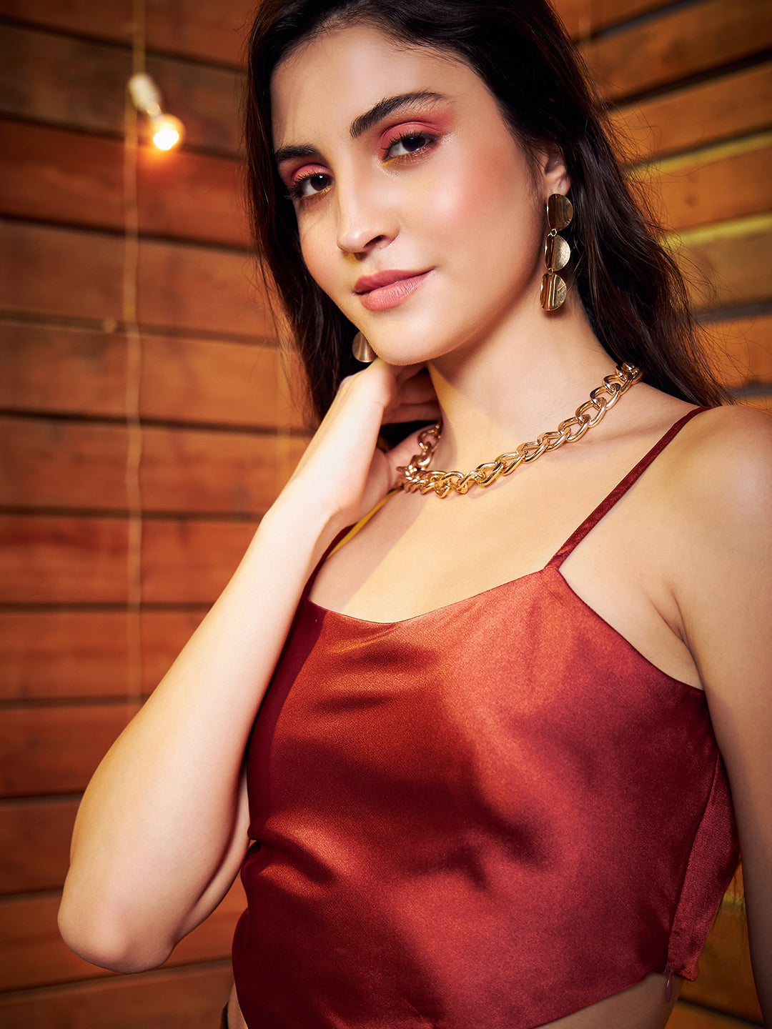 Introducing the Berrylush Solid Maroon Square Neck Sleeveless Satin Zipper-Up Cropped Top - a statement piece that promises to elevate your party wardrobe with effortless elegance. Crafted in luxurious, woven satin and rendered in a rich maroon hue, this top brings together sophistication and contemporary style. The sleeveless design paired with the distinctive square neckline accentuates your shoulders, offering an exquisite frame for your collarbones. Thanks to its opaque polyester material, you're ensured both comfort and class. Its cropped length adds a trendy twist while the zipper closure ensures a seamless fit—perfect for those who want to make an unforgettable impression at any soirée.