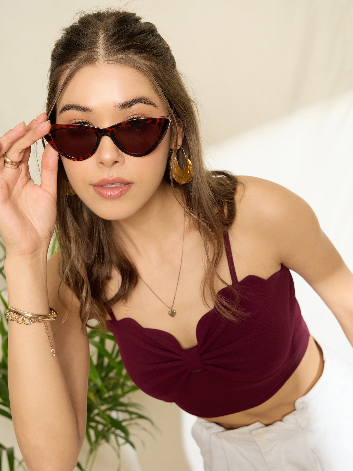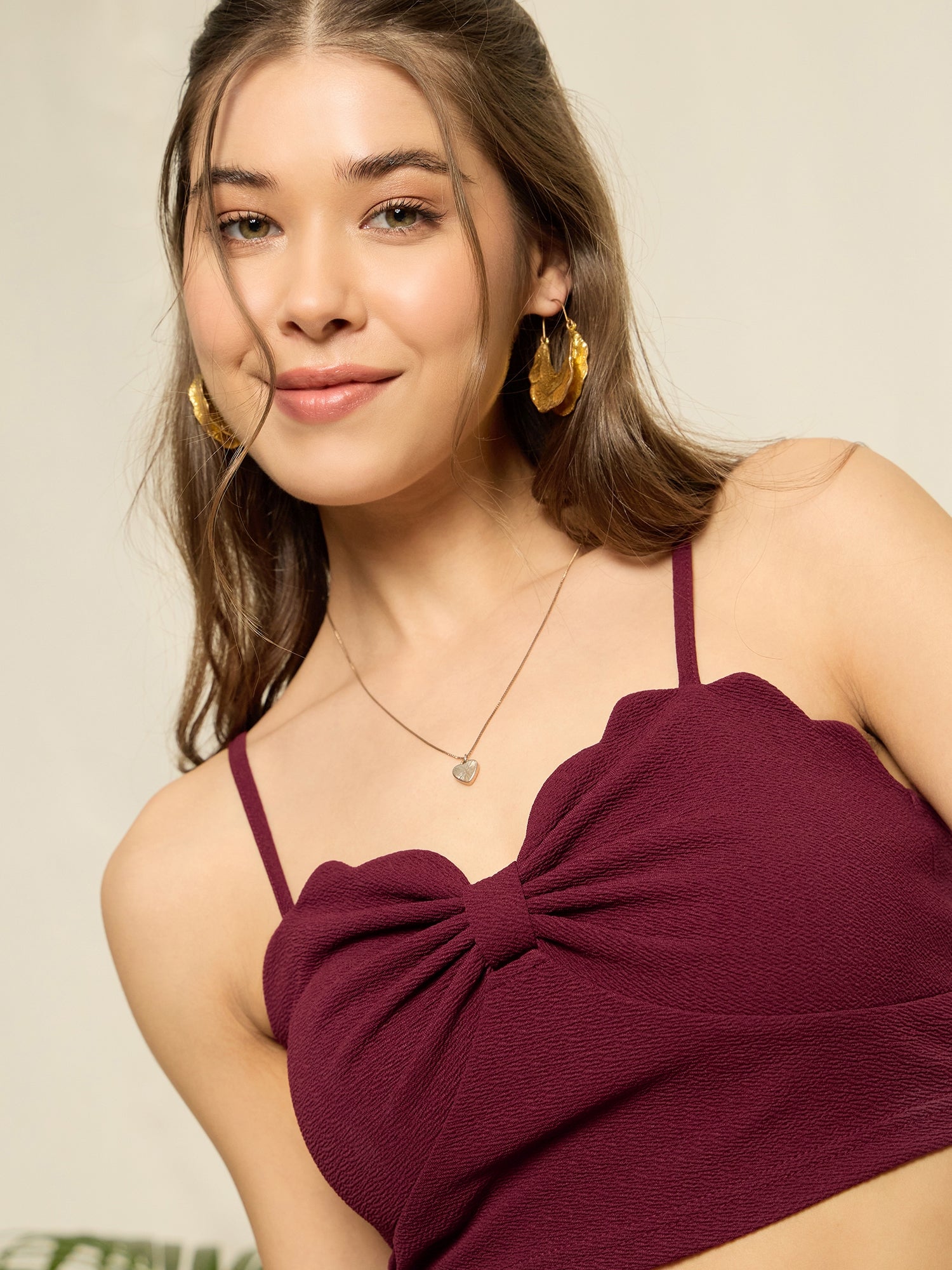 Berrylush Women Solid Maroon Sweetheart Neck Sleeveless Scallop Trim Twisted Crop Top