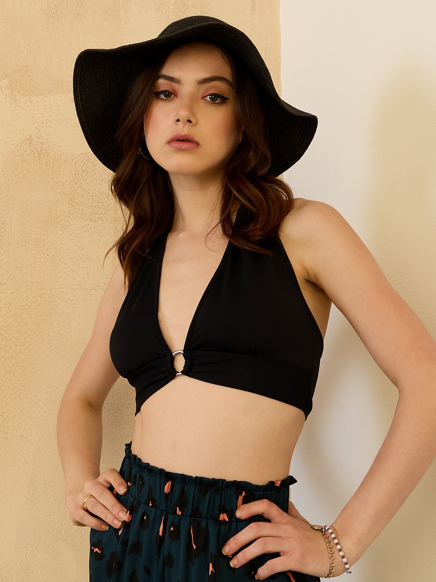 Berrylush Women Solid Black Halter Neck Front Metal Ring Backless Knitted Crop Top