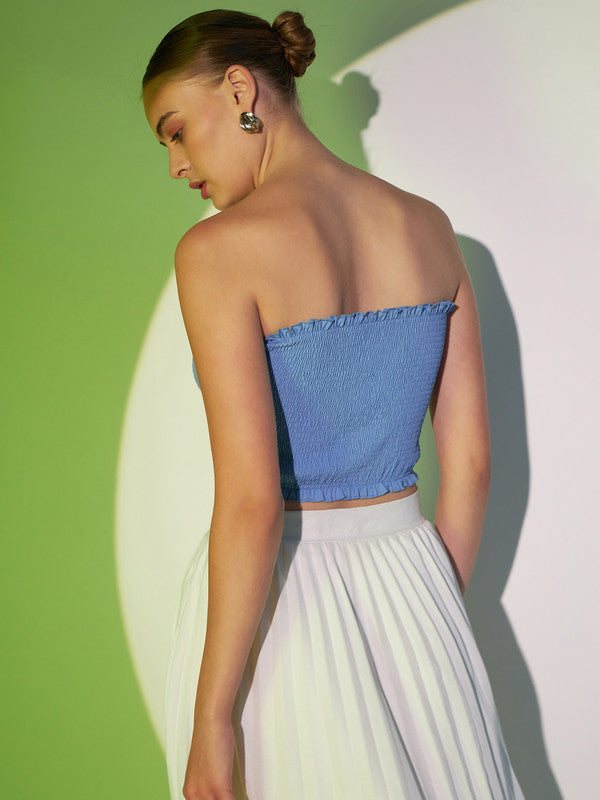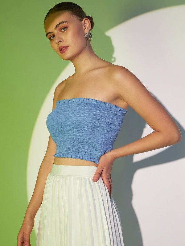 Berrylush Women Solid Light Blue Strapless Neck Sleeveless Backless Smocked Crop Tube Top