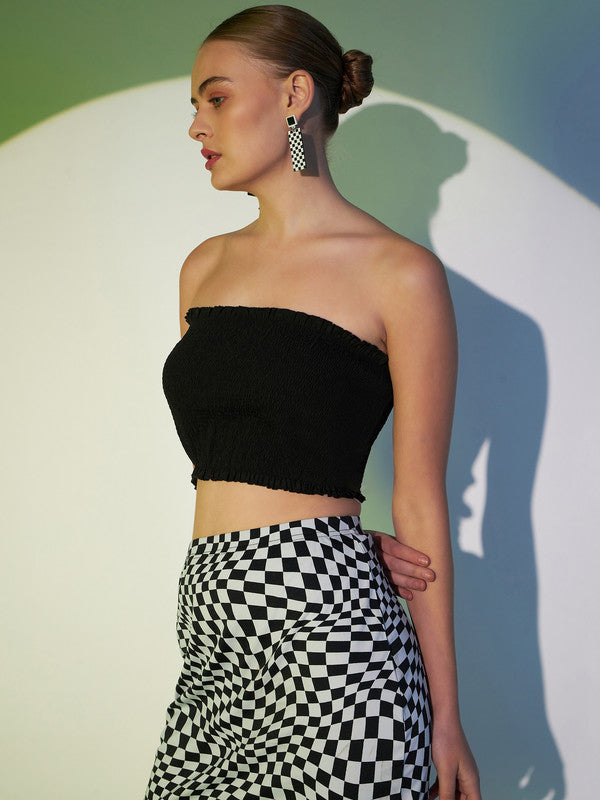 Berrylush Women Solid Black Strapless Neck Sleeveless Backless Smocked Crop Tube Top