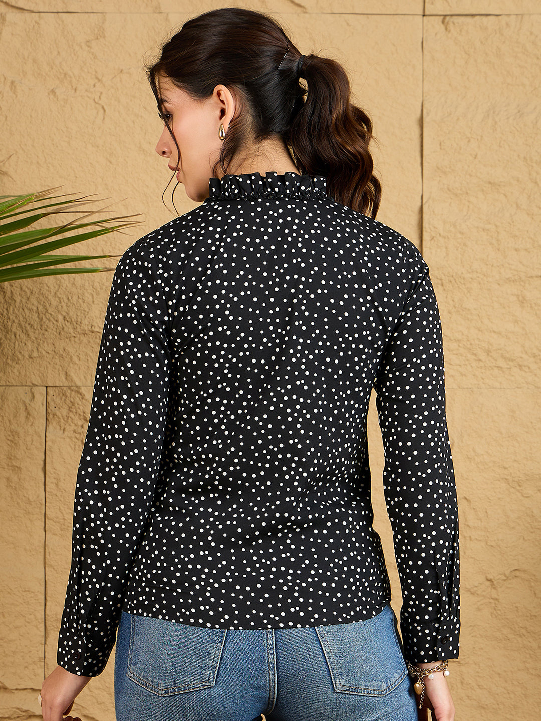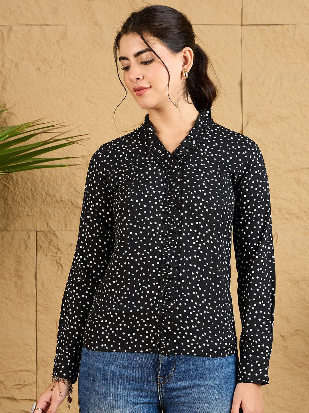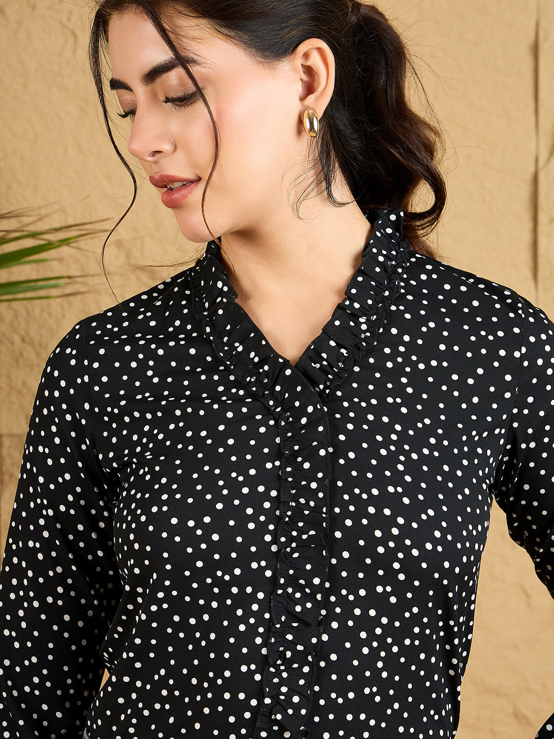 Make a statement in this charming Black and White Polka Dot Printed V-Neck Regular Top from Berrylush. The classic black and white pattern gets a contemporary update with elegant ruffle detailing, creating a perfect balance between playful and sophisticated. The flattering V-neckline draws attention to your collarbone, while the long sleeves ensure versatile wear across seasons. Crafted from high-quality opaque polyester, this woven top maintains its shape throughout the day. Perfect for casual outings, coffee dates, or work-from-home days, this regular-length piece effortlessly combines comfort with style. Pair it with your favorite jeans or skirt for an instantly put-together look that turns heads.