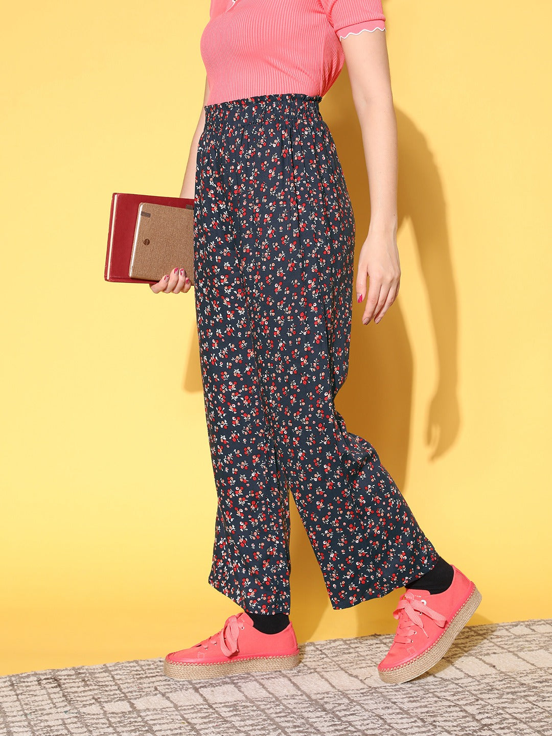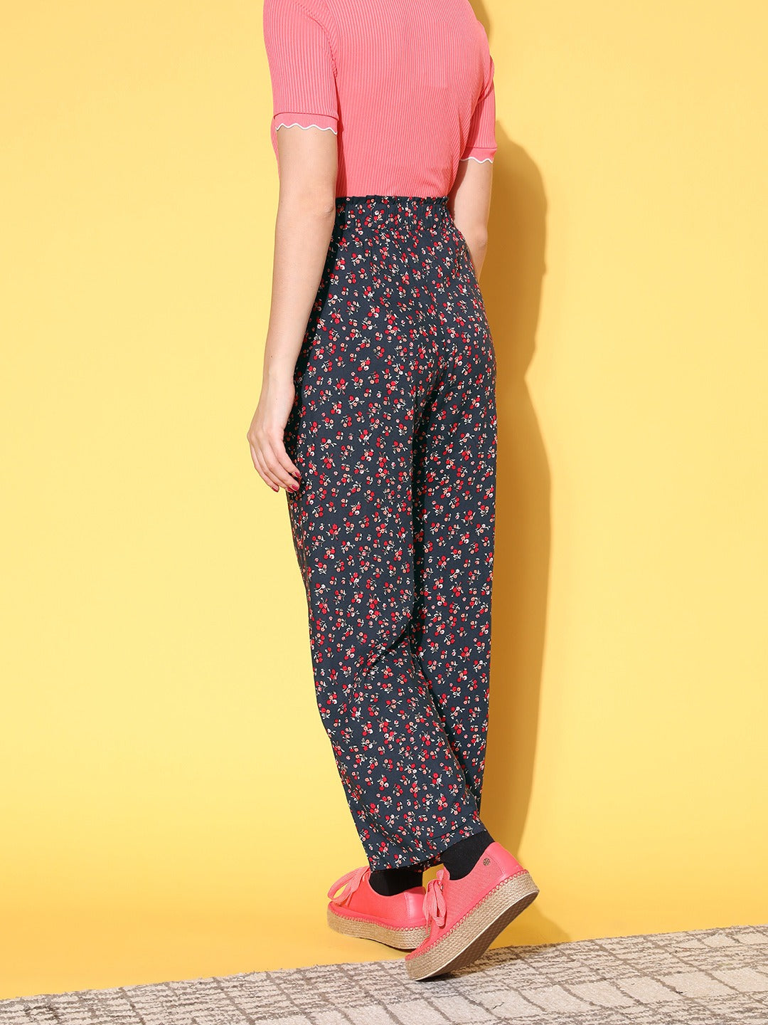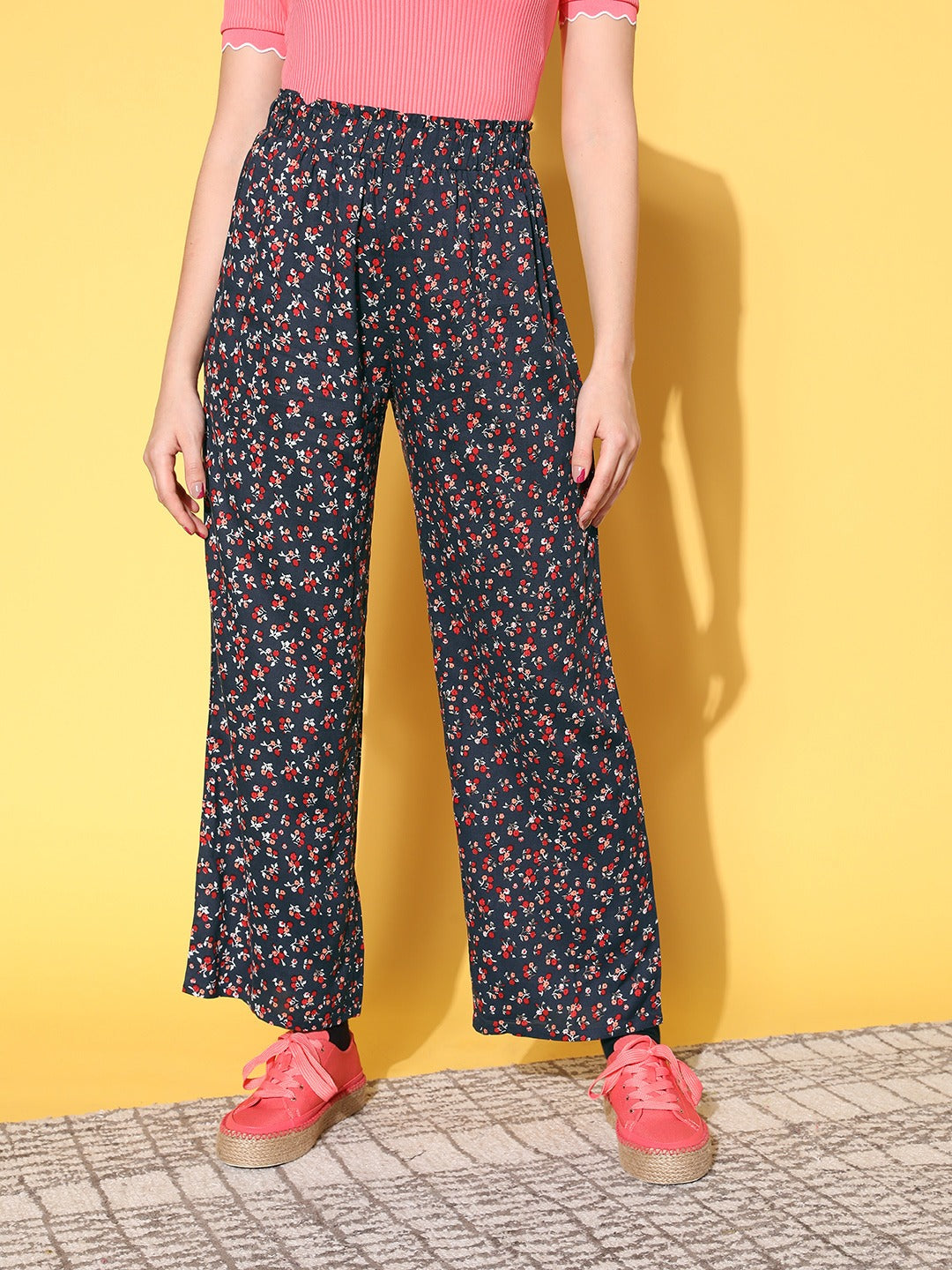 Berrylush Women Navy Blue & Red Floral Printed High-Rise Elastic Waist Pleated Trousers