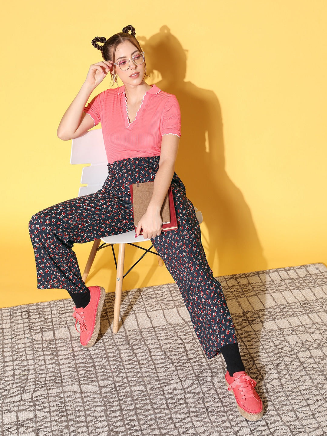 Make a delightful addition to your casual contingent that keeps you upgraded with the latest trend just like this charming Navy Blue Floral Printed Relaxed High-Rise Pleated Trousers from Berrylush. Decorated with a navy-blue and red floral print that brightens up the style of these trousers with a tinge of nature's beauty. Showing off a high-waist design that gives trousers a chic style note while gracefully elongating your legs with a slimmer appearance. Moreover, the pleated design lends these trousers a resemblance to a parallel fashion statement with flattering detail. Complete your look flawlessly by wearing it with a fitted top, block heels, floral hoop earrings, and a matching side bag.