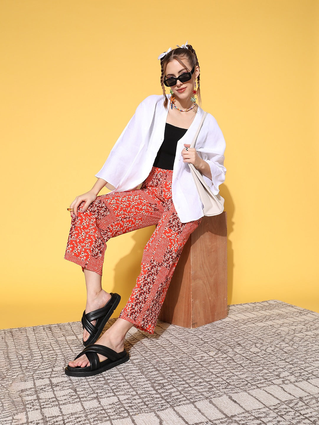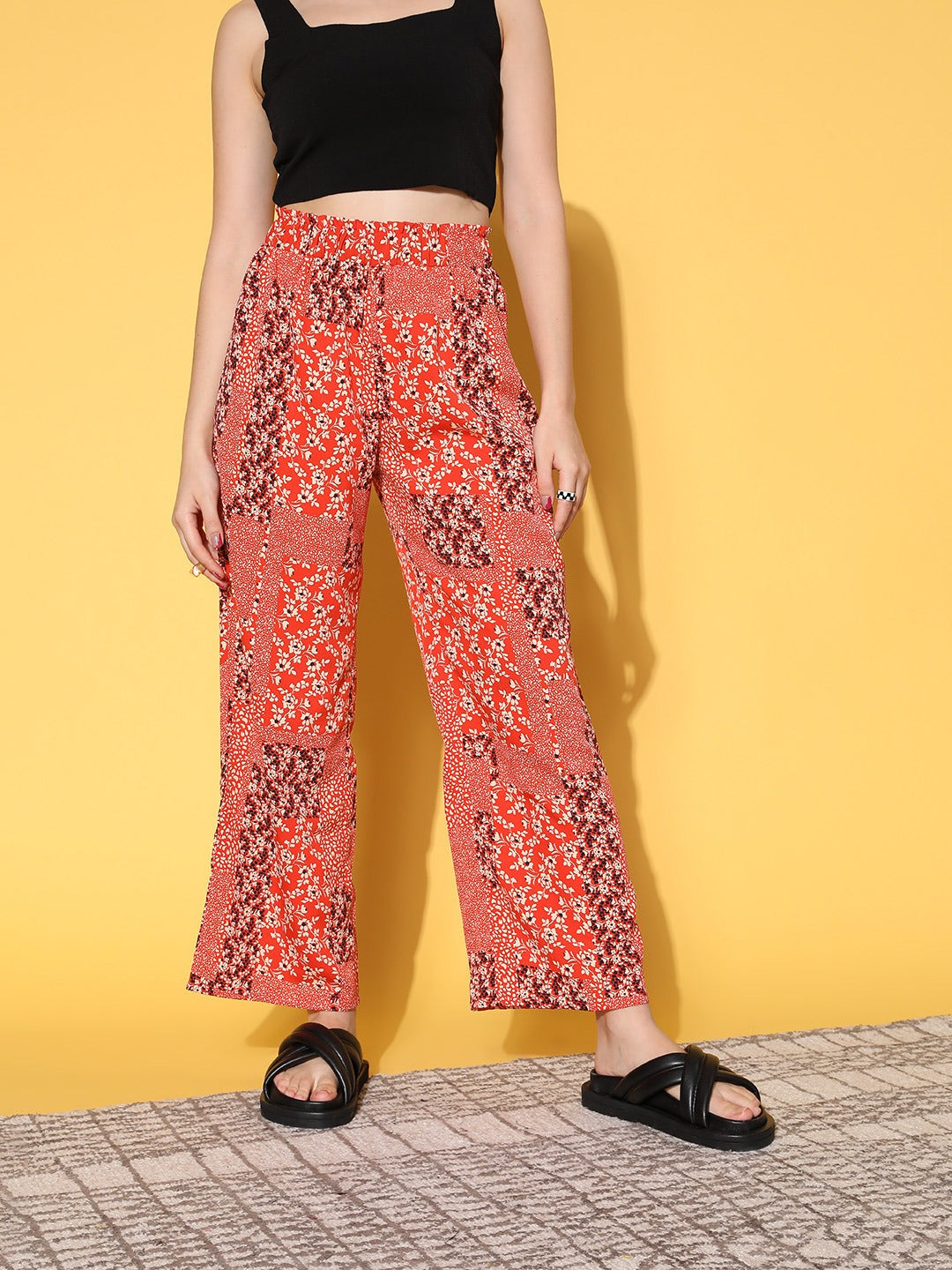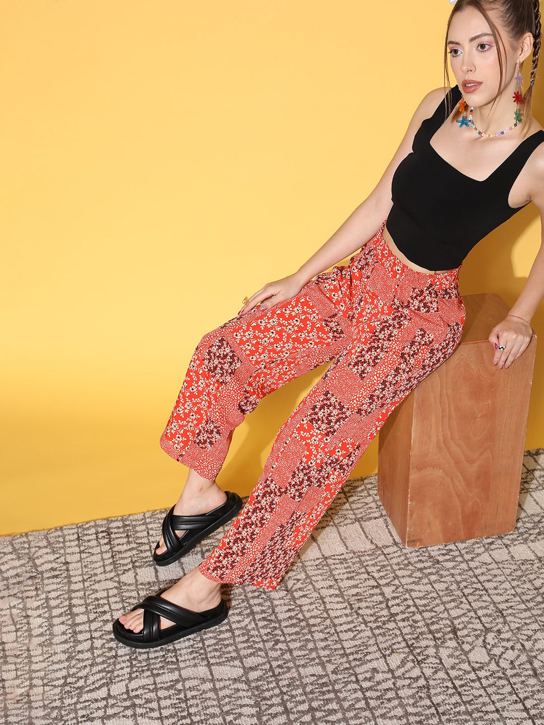 Berrylush Women Red Floral Printed High-Rise Elastic Waist Pleated Trousers