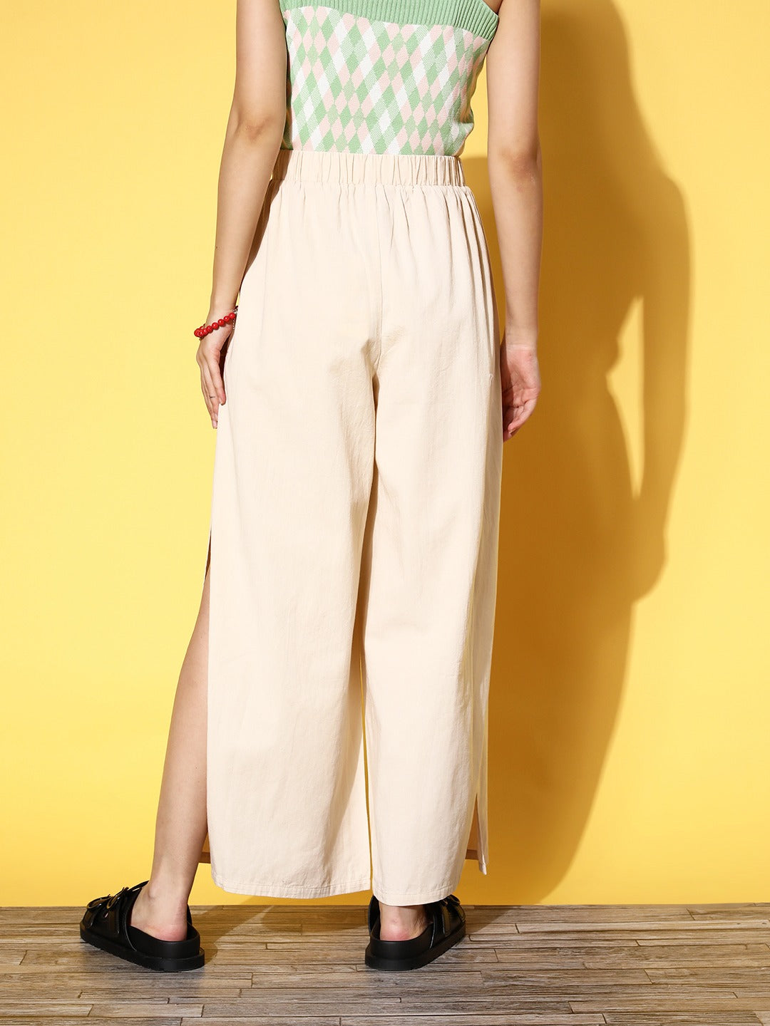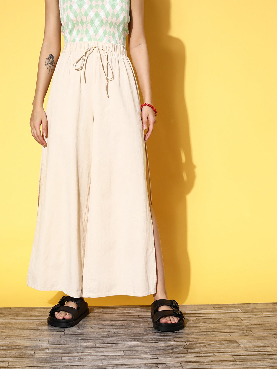 Berrylush Women Solid Beige Drawstring High-Rise Waist Cotton Straight Leg Slitted Trousers
