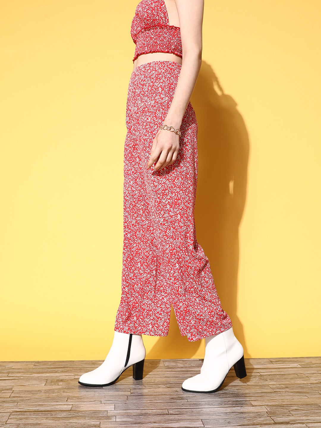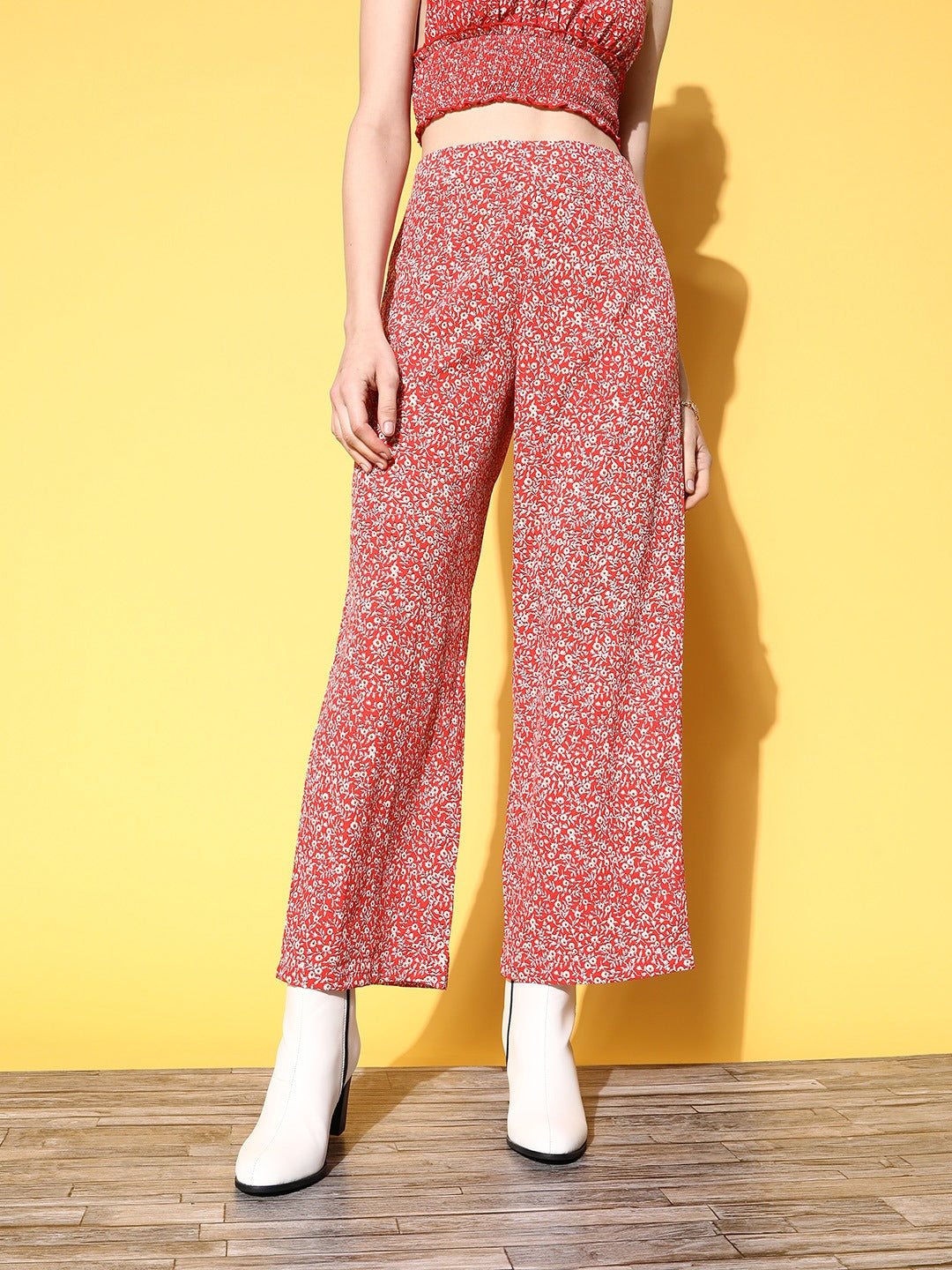 Berrylush Women Red & White Floral Printed Loose Fit High-Rise Waist Relaxed Trousers