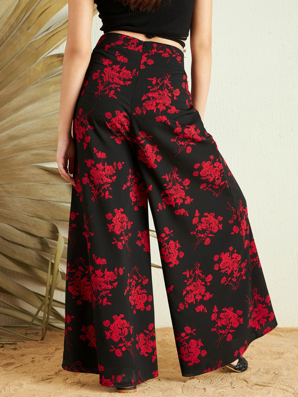 Berrylush Women Black & Red Floral Printed High-Rise Waist Slip-On Wide-Leg Regular Culottes Trousers