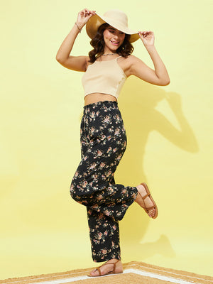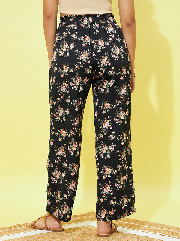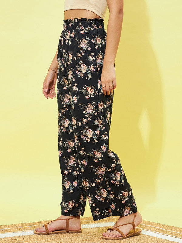 Berrylush Women Black Floral Printed High-Rise Elastic Waist Loose-Fit Slip-On Pleated Regular Trousers