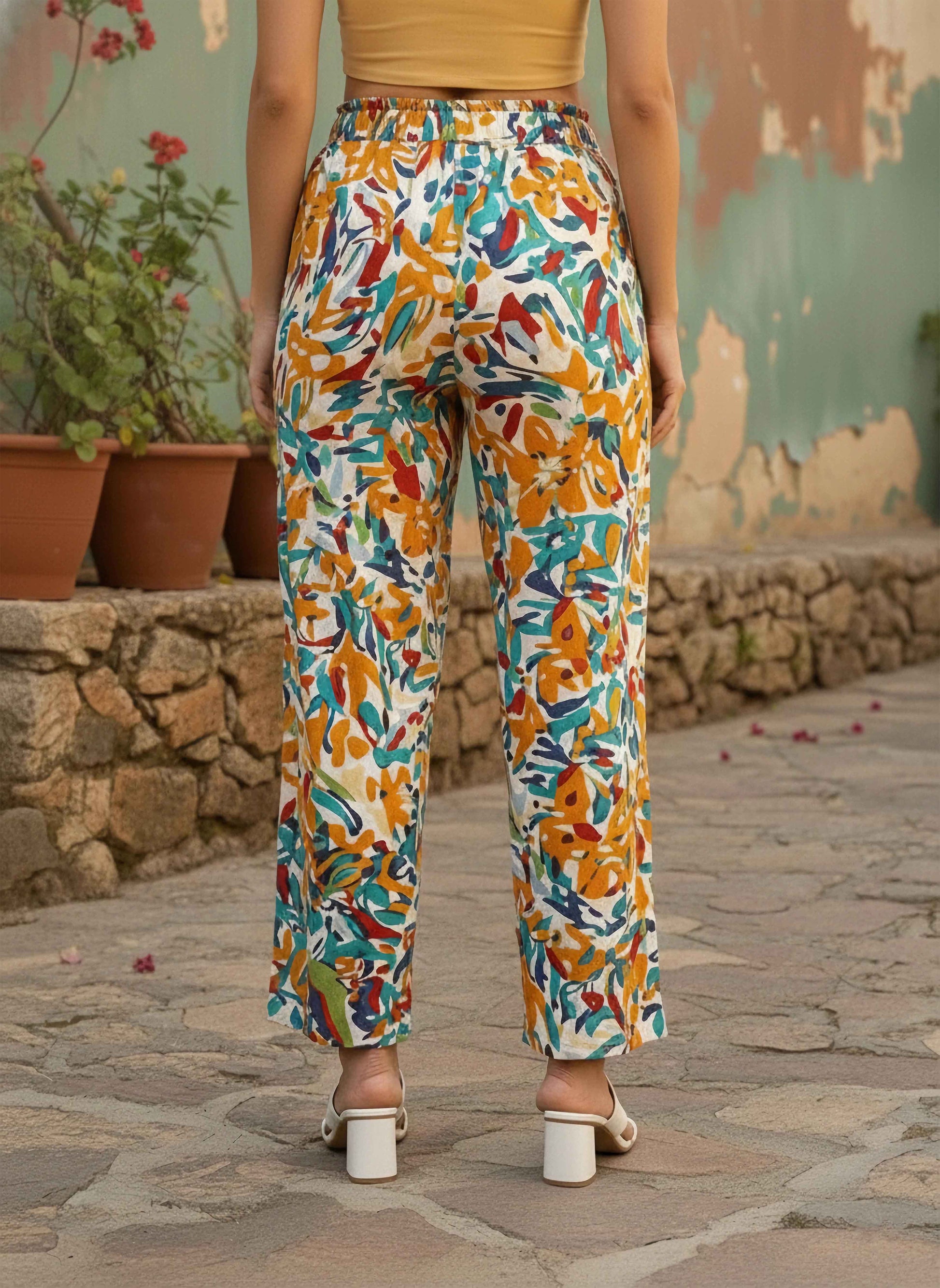 Step out in style with Berrylush's latest Parallel Trousers, embodying a vibrant mix of white and multicoloured abstract prints that capture the essence of carefree travel. These trousers feature a high-rise waist with a comforting elastic band for easy slip-on convenience, ensuring you look fabulous without compromising on comfort. Crafted from premium polyester fabric in woven weave, these pleated trousers offer an elegant drape while maintaining opacity. Perfect for any getaway or casual outing, their lightweight design promises ease and versatility all day long.