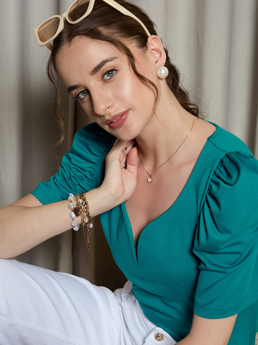 Berrylush Women Blue Solid Round Neck Puff Sleeve Regular Tshirt