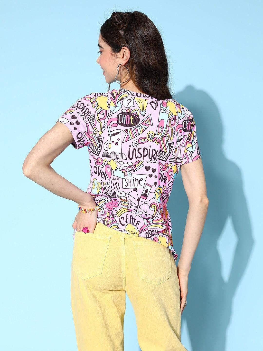 - Pink and multicolour conversational print gives this t-shirt a charismatic look