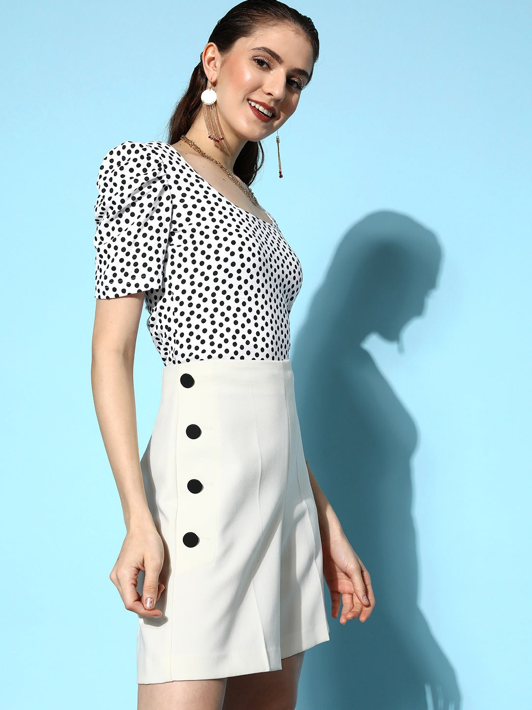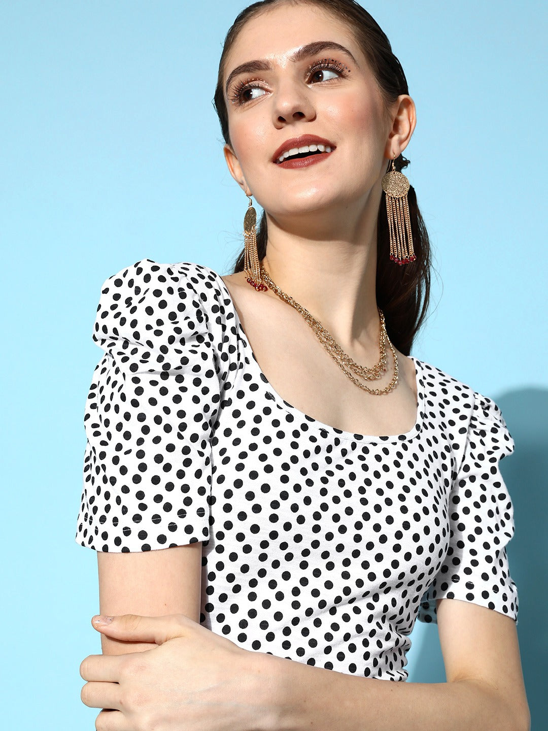 Upgrade your casual closet with a combination of sporty and feminine styles just like this cute White & Black Polka Dot Printed Scoop Neck Knitted Cotton Regular T-Shirt designed by Berrylush. Featuring short-puff sleeves that give your arm an eye-catching and convenient closure with comfortable movements. Made with a regular fit to make this t-shirt appears modest and smart with the appropriate silhouette. Moreover, the regular length gives your upper body proper coverage with a sophisticated appeal. You can team up this t-shirt with fancy shorts, a pair of cool sneakers, matching sunglasses, and a black waist bag to get a stylish appearance.