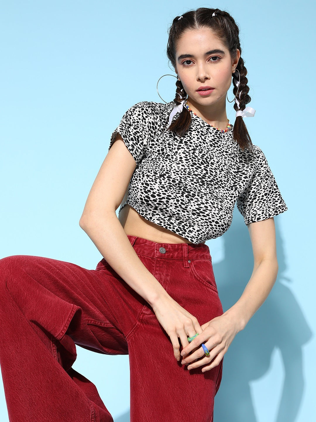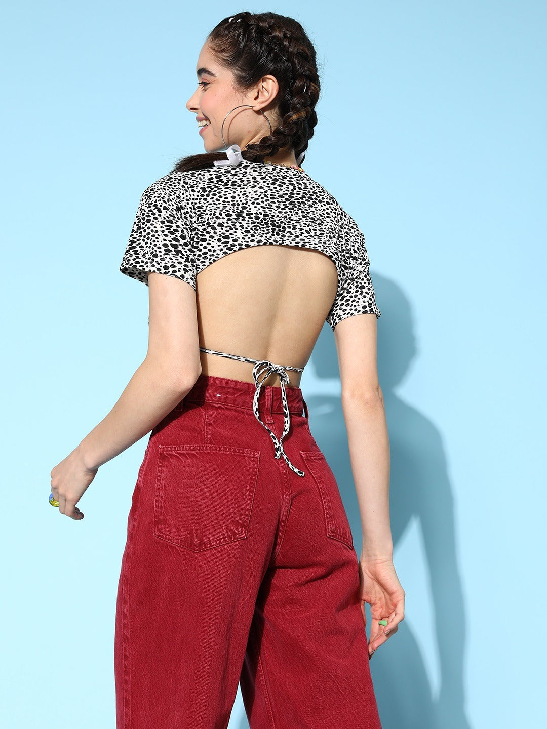 Be bold, be sexy and be experimental with your fashion game this season with this White & Black Animal Printed Round Neck Open-Back Tie-Up Cotton Cropped Top designed by Berrylush for its exclusive print and pattern collection. Adorned with a slim fit design to showcase your attractive feminine figure. Spun from the finest cotton fabric and cotton jersey material to keep this top lightweight and breathable for the skin. Also, the knitted detailing enhances the overall flexibility of this top without any stretchy feel. Complete your casual look by wearing this slim-fit top with a pair of red cargo pants, white sneakers, and a waist bag.