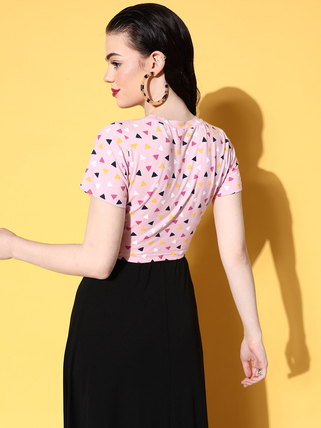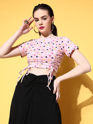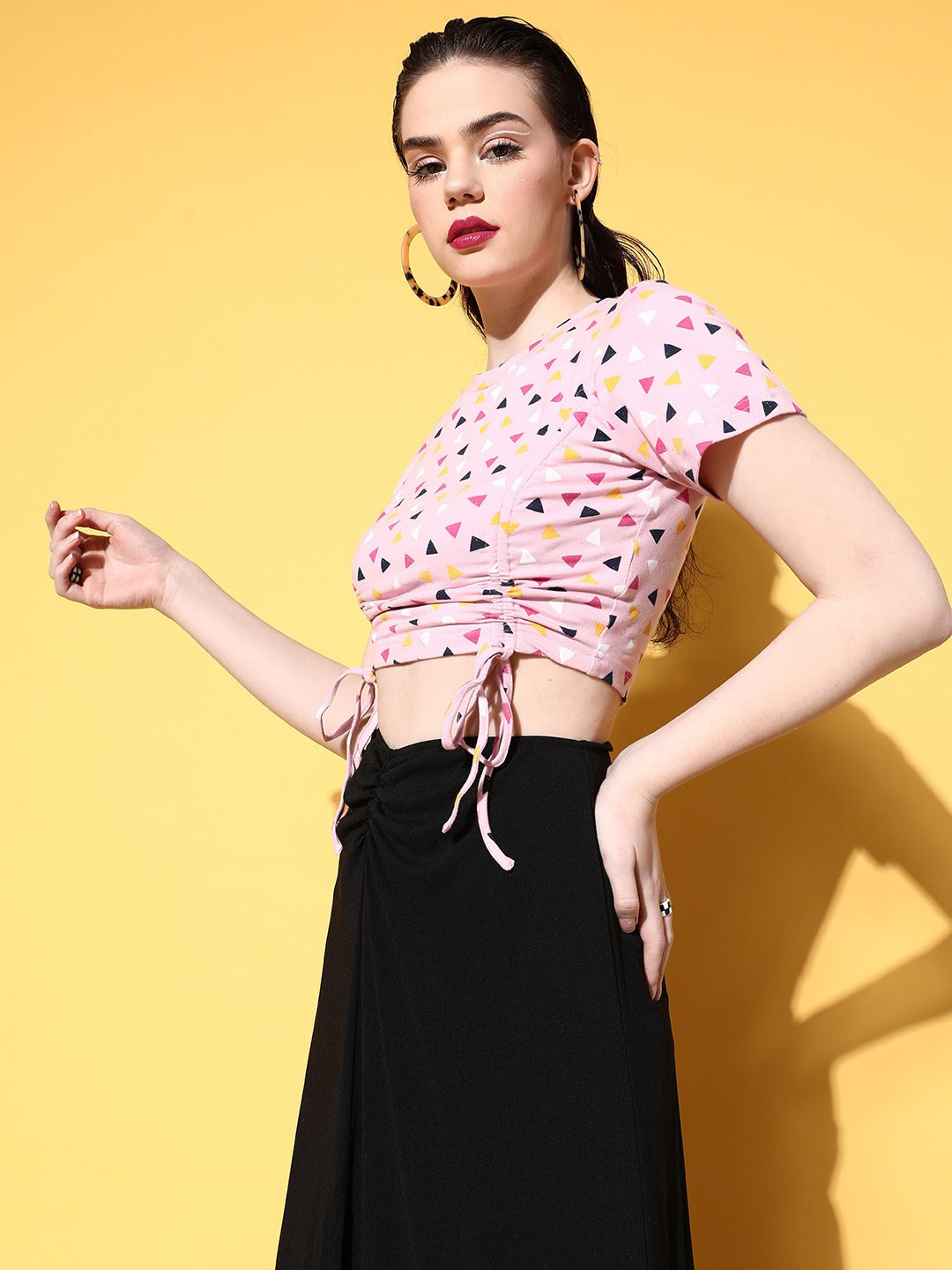 Berrylush Women Pink & Black Geometric Print Round Neck Waist Tie-Up Cotton Ruched Crop Top